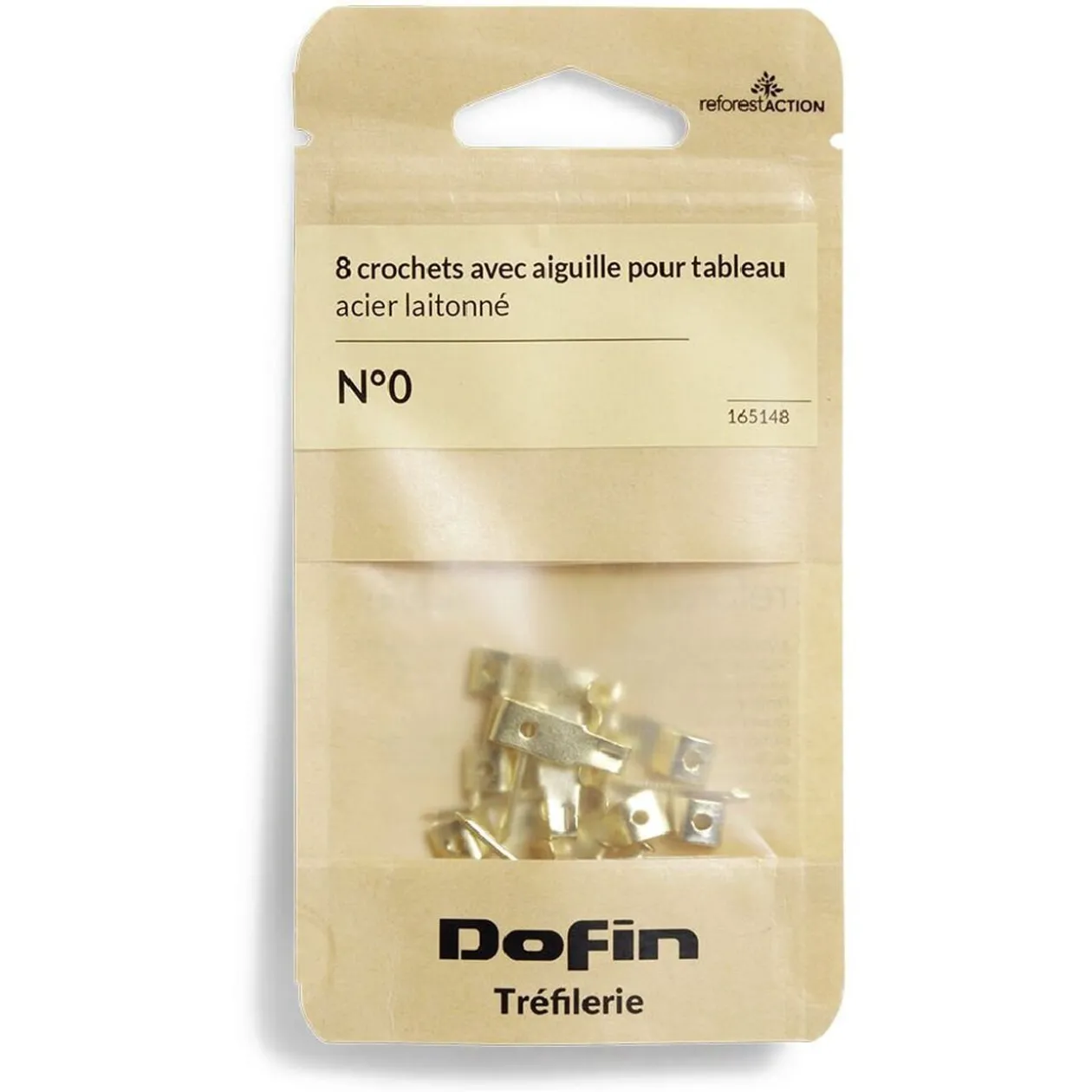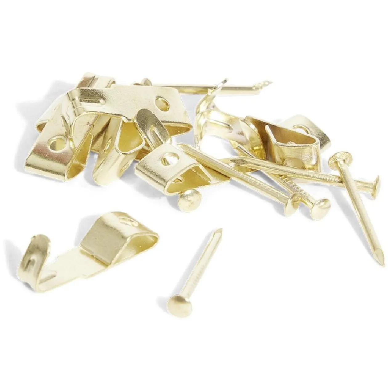 Lot de 8 crochets en acier laitonné avec aiguilles N°0 pour fixer des tableaux et cadres légers au mur.