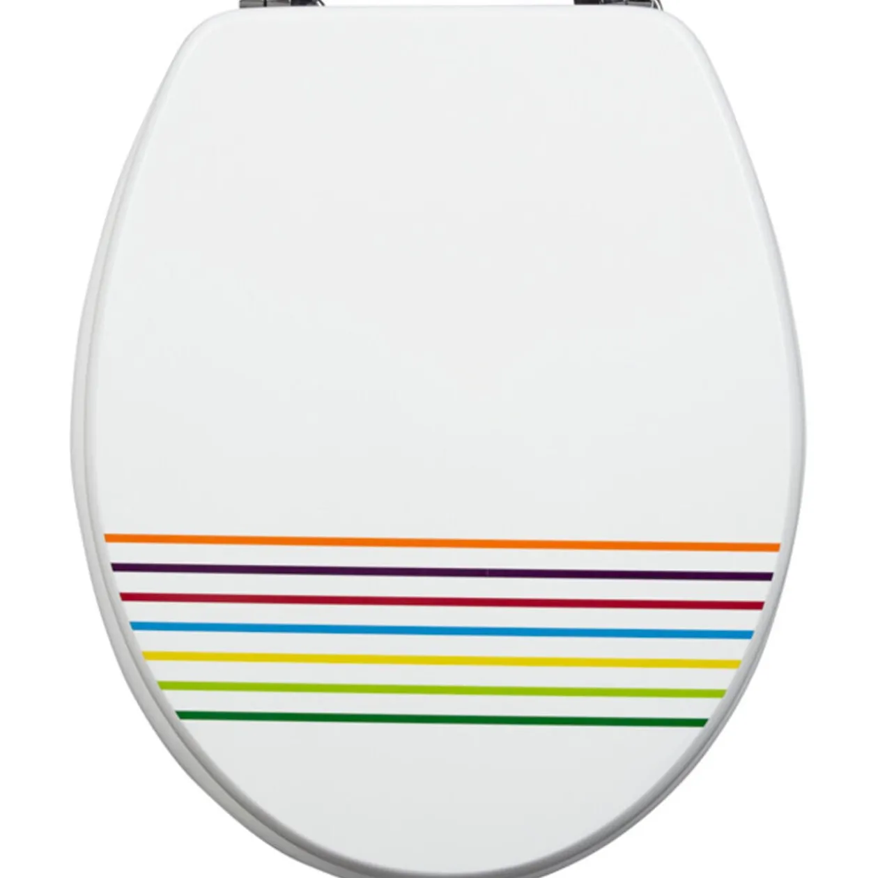 Abattant WC blanc avec rayures colorés, dim. 43×36 cm, MDF (panneau de fibres de bois).