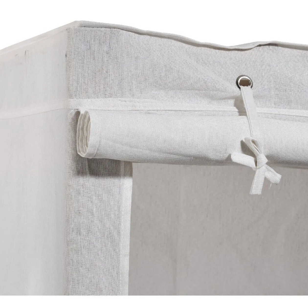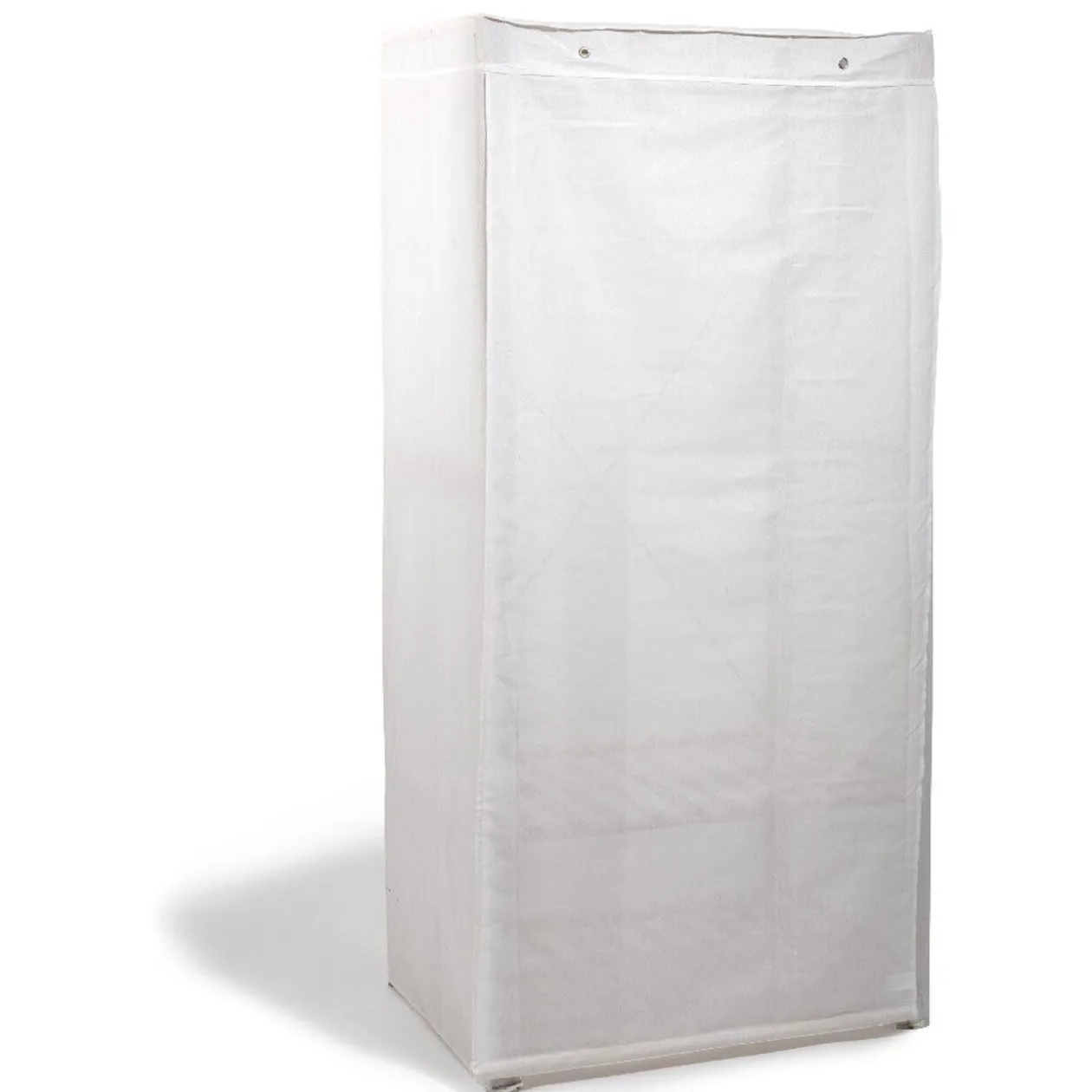 Armoire dressing en pin avec renforts métalliques et housse blanche en tissu 90 % coton, 10 % polyester.
