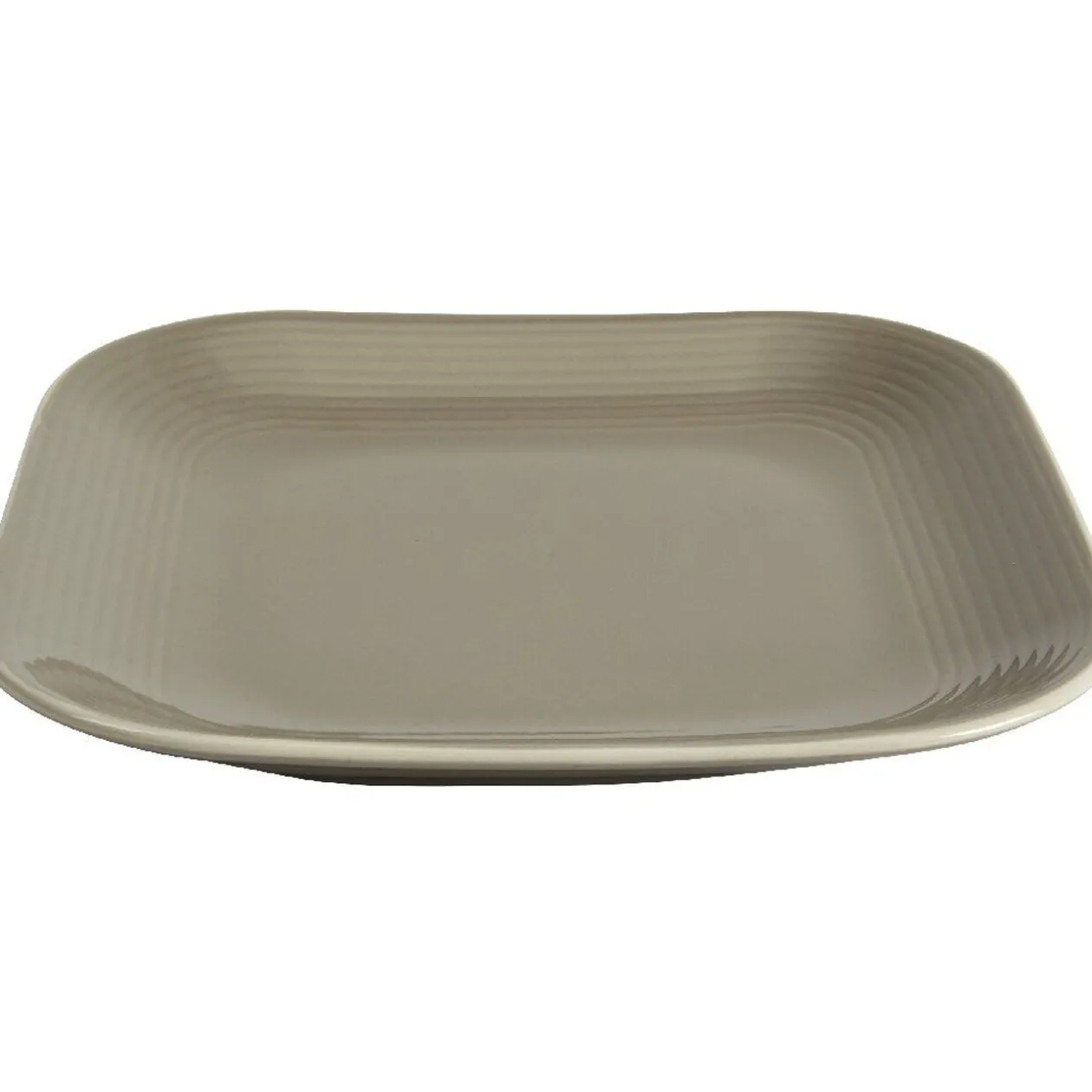Assiette à dessert carré en grès, de couleur taupe à l’intérieur et blanche à l’extérieur.