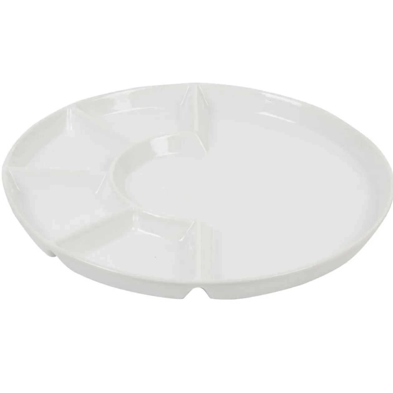Assiette à fondue / barbecue blanche, 5 compartiments (1 grand pour la viande et 4 pour les sauces), dim. Ø23,8xh.2,2 cm, porcelaine.