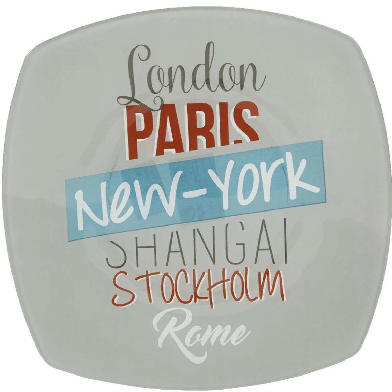 Assiette plate carrée à bord arrondi design city avec inscription « London, Paris, New York, Shangai, Stockholm, Rome ».