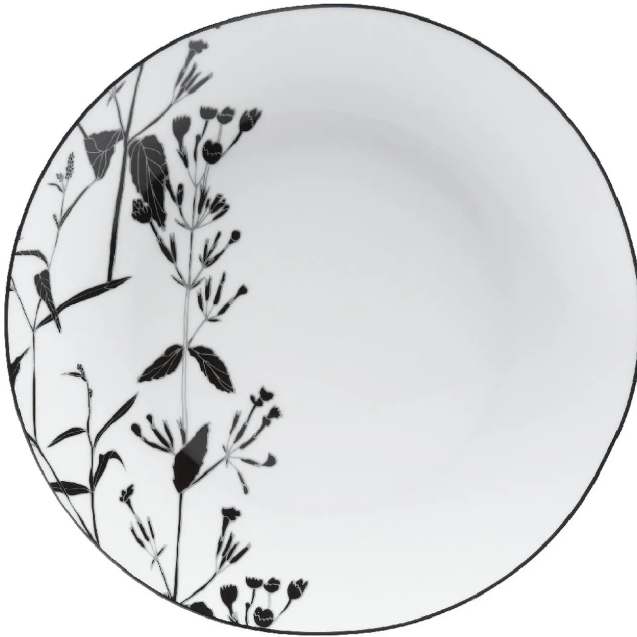 Assiette ronde blanche avec décor tiges et feuilles noires, collection Influences.