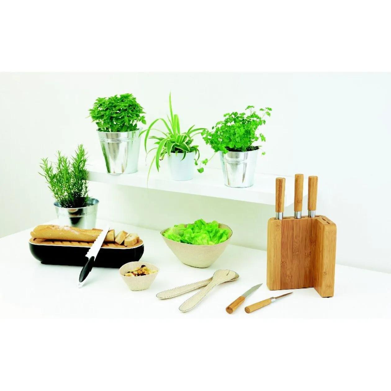 Bloc en bambou et 5 couteaux : 1 couteau du chef, 1 couteau à pain, 1 couteau à trancher, 1 couteau à légumes et 1 couteau utilitaire, lame en acier et manche en bambou. Les autres accessoires ne sont pas inclus.