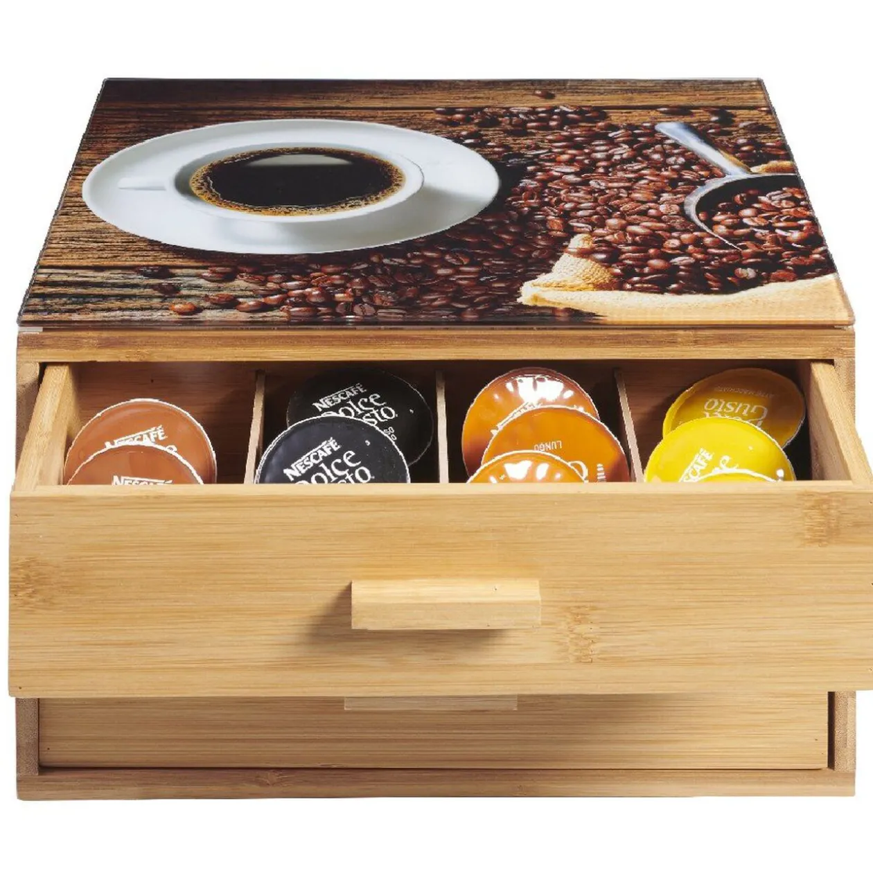 Optez pour ce range-dosettes à double tiroirs en bambou et plateau en verre design , déco et pratique pour poser votre cafetière dessus.