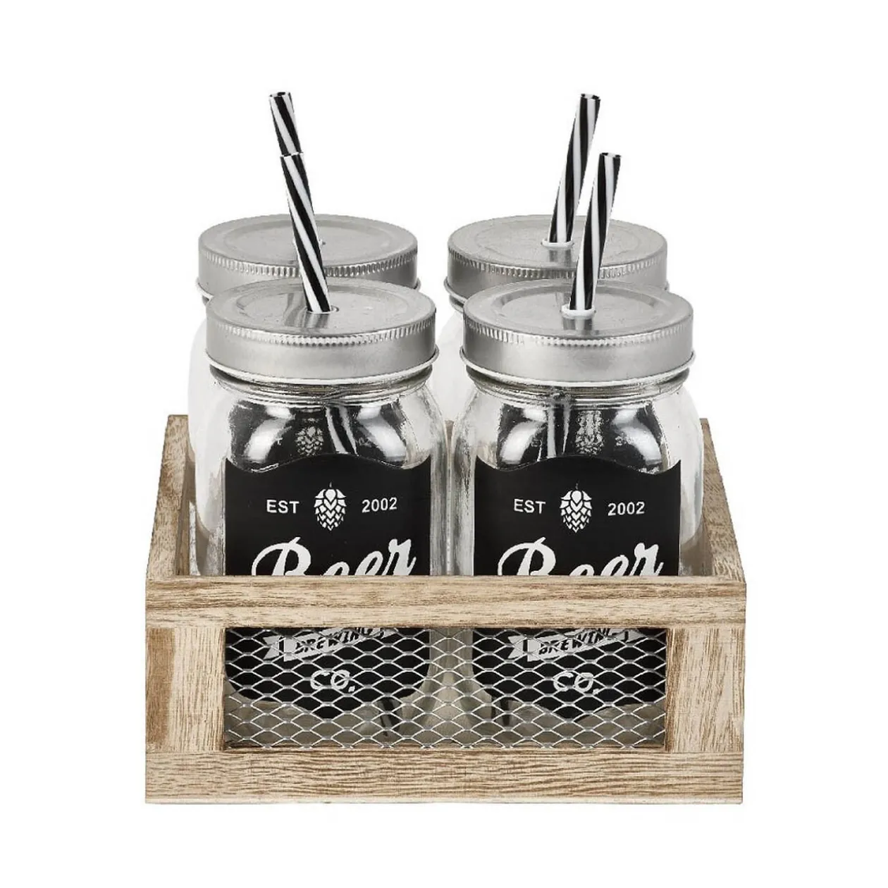 Proposez un look original à votre apéritif avec ces 4 bocaux au design bistrot noir et blanc. Leur surface en ardoise vous permet d’écrire le nom de chaque invité afin de ne pas mélanger les verres alors régalez- vous ! Servez vos boissons avec classe dans le joli présentoir en bois inclus.