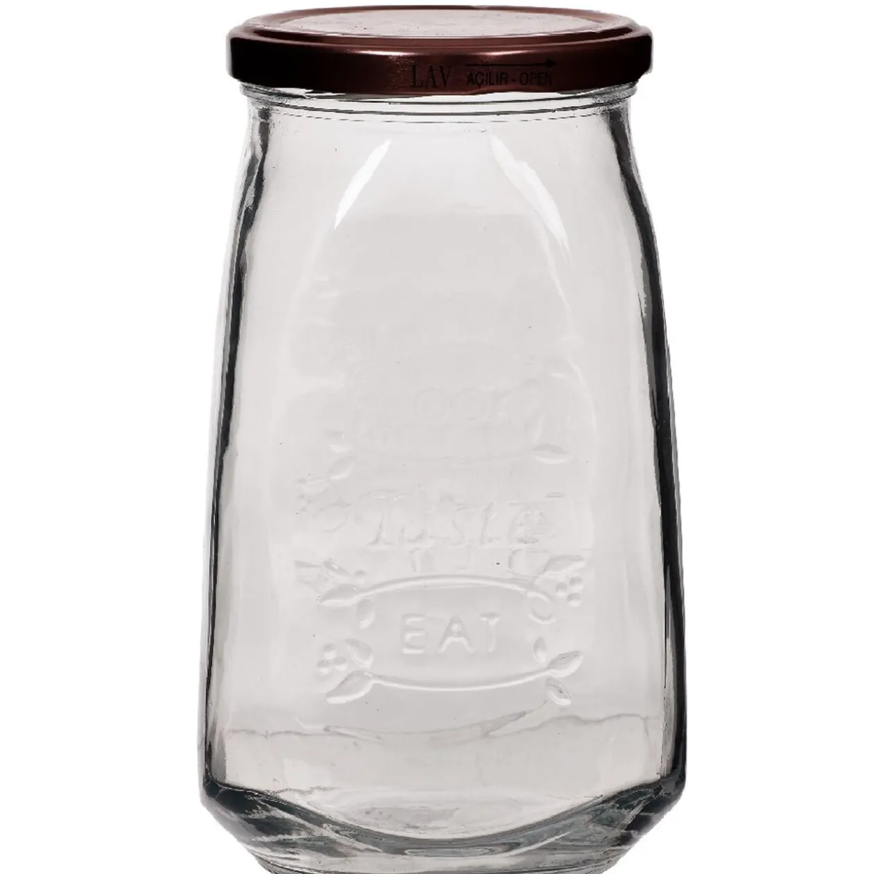 Bocal en verre transparent avec inscriptions en relief « taste » et « eat ». On adore son look vintage qui nous rappelle les bonnes confitures faites maison. Les inscriptions apparaissent également sur le couvercle couleur cuivre.