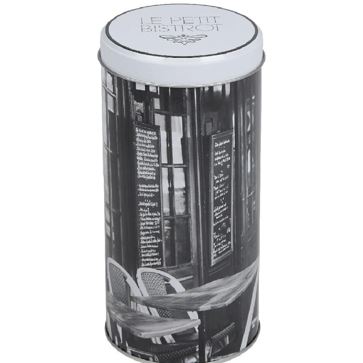 Boîte à café cylindrique design bistrot de couleur noir et blanc.