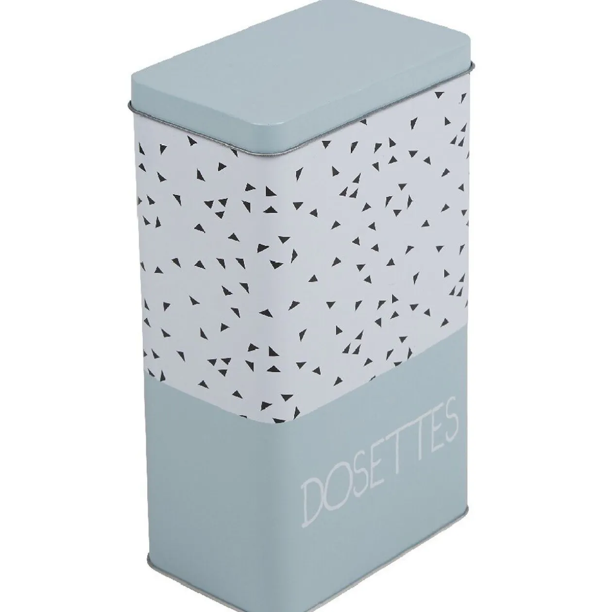 Boîte à café rectangulaire de couleur vert d’eau et blanc motifs triangles noirs.
