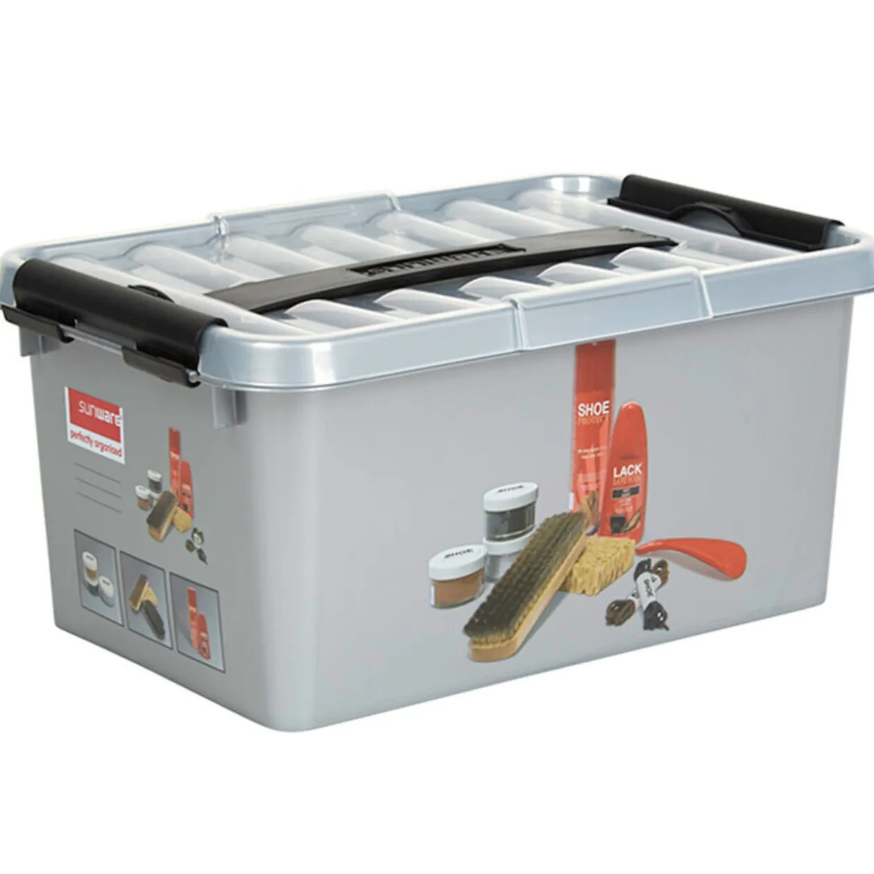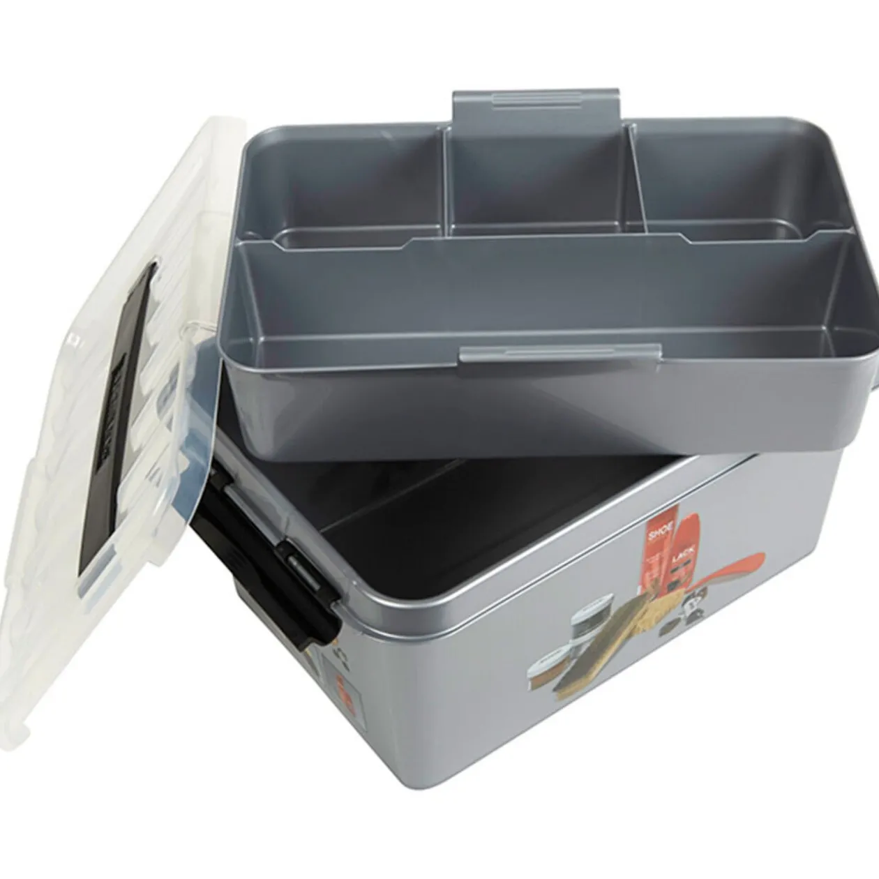 Boîte de rangement spécial cirage 6 L, dim. 30x20x14 cm, plastique. Nombreux compartiments, poignée et fermeture par clip.