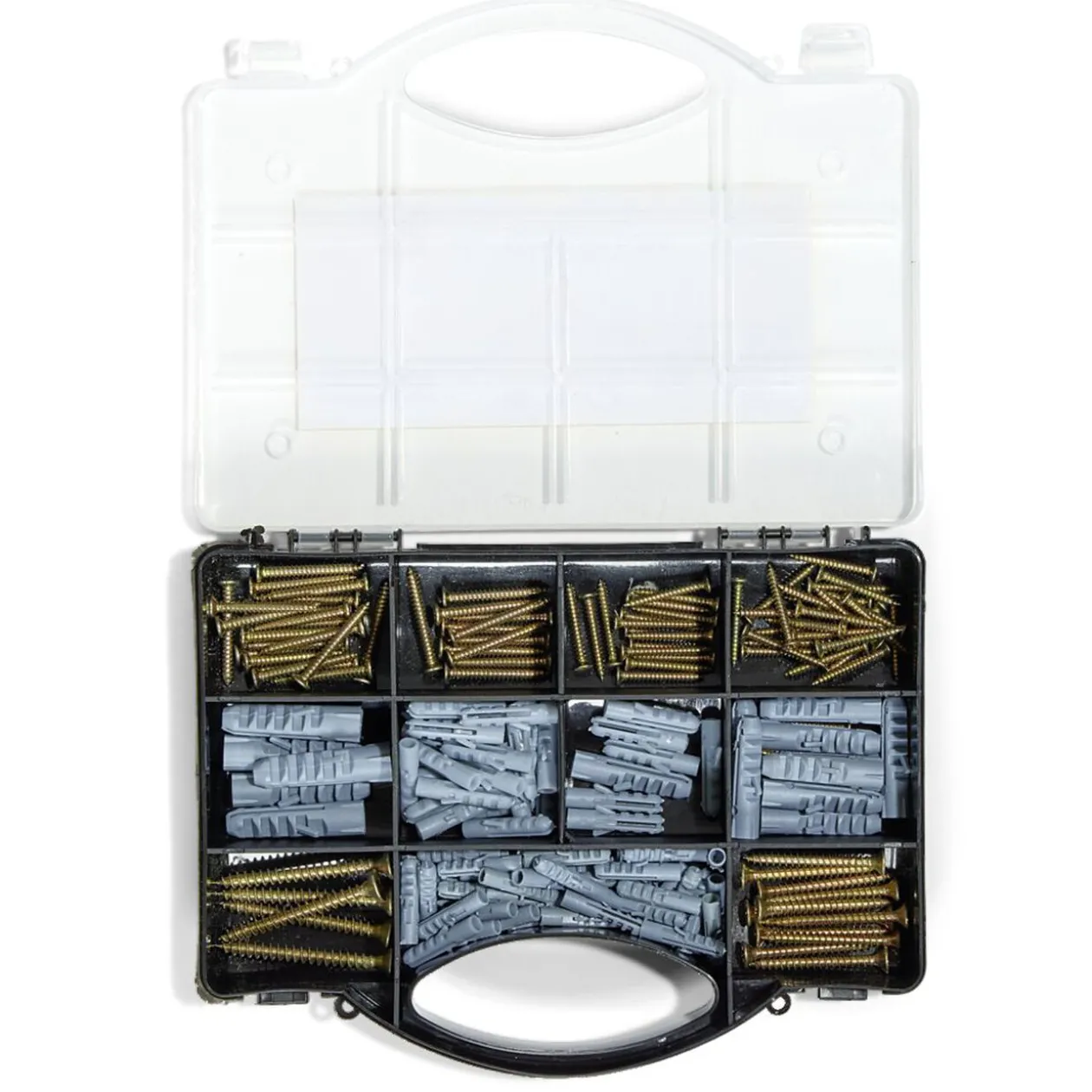 Boîte de 184 pièces de chevilles et vis, idéale pour tous vos projets de bricolage, elle offre une variété de tailles et types.
