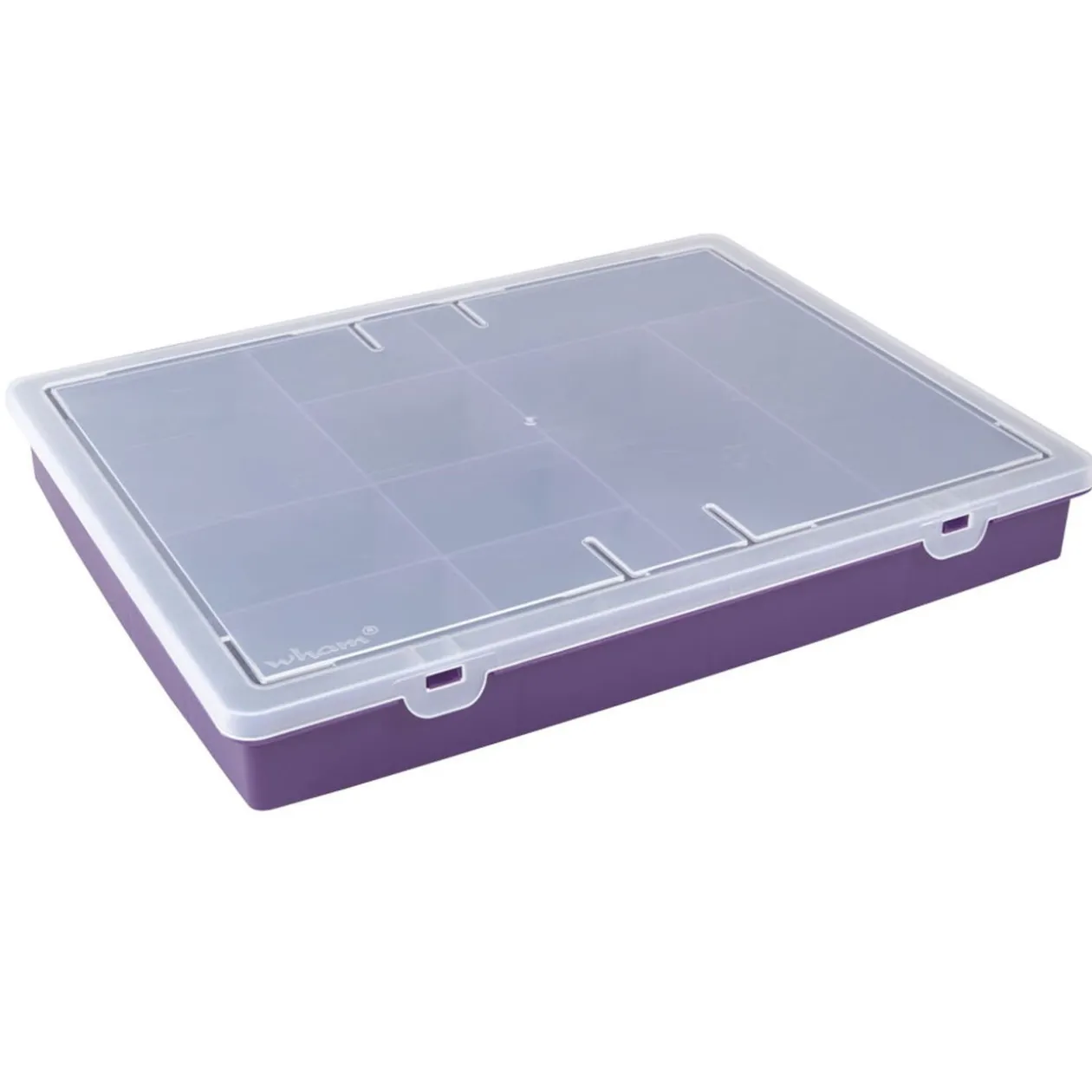 Boîte de rangement 10 compartiments violette avec couvercle transparent, dim. 38x30xh.5 cm, plastique.