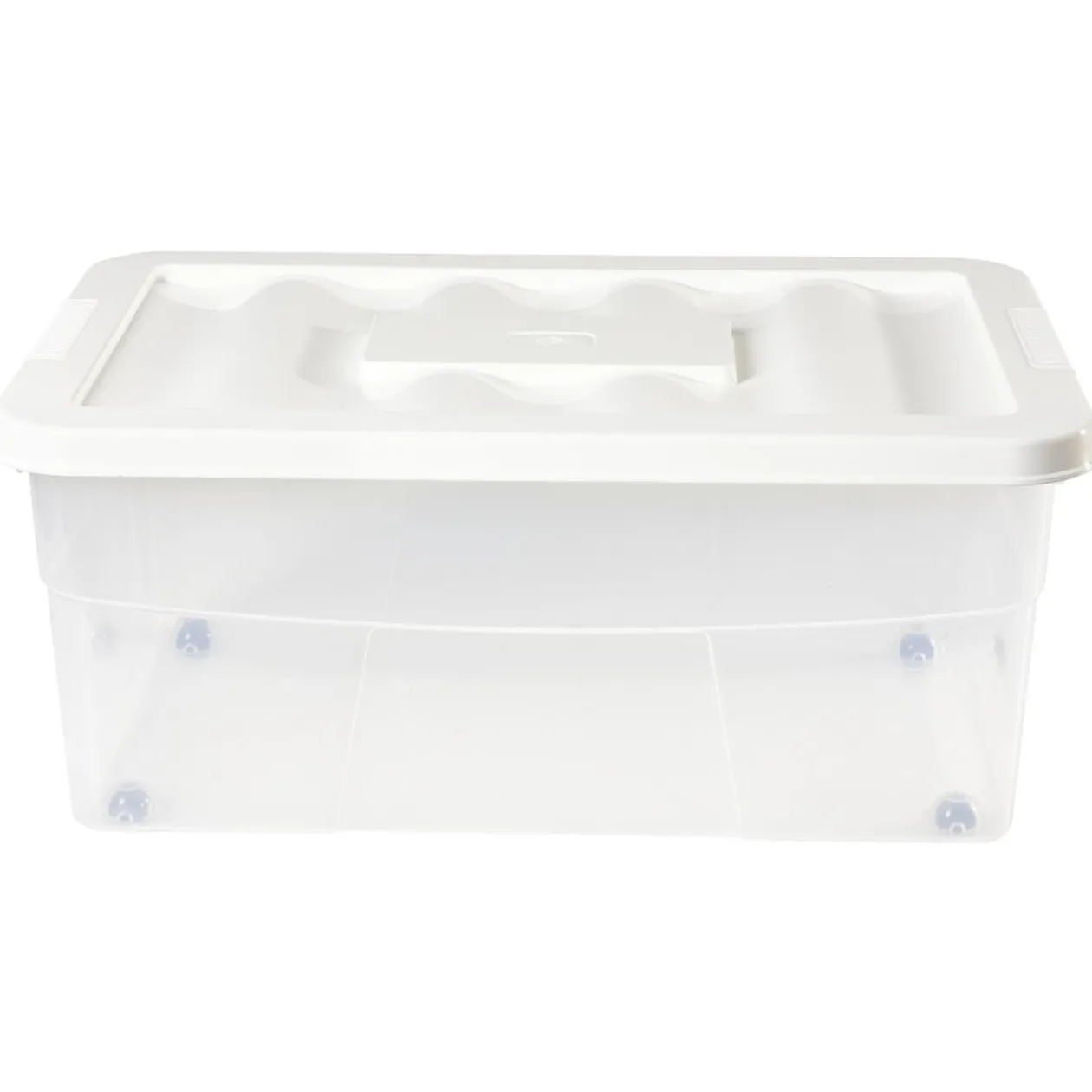 Optimisez votre rangement grâce à cette boîte transparente sur 4 roulettes avec couvercle.