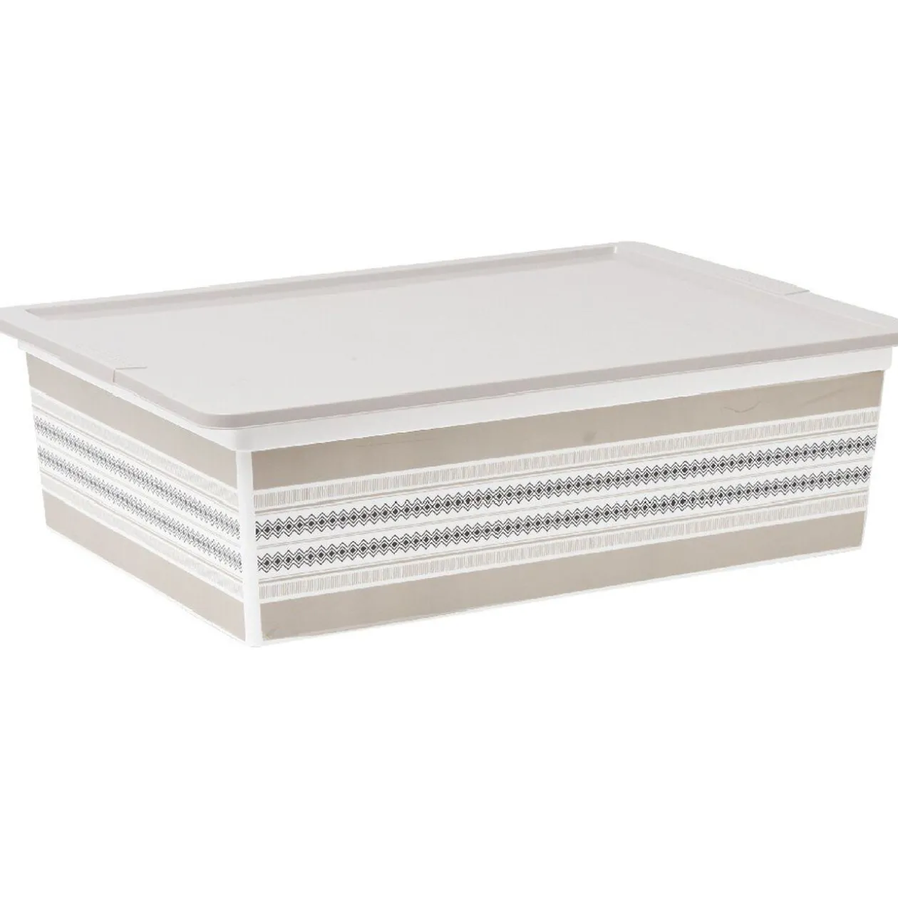 Boîte de rangement de couleur blanc, beige et noir à motifs.
