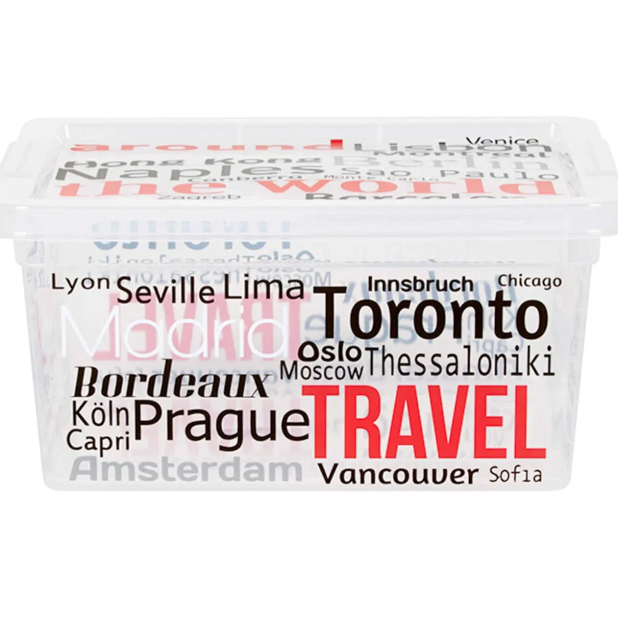 Boîte de rangement avec couvercle design noms de villes 2 L, dim. 19,5×16,5×9,5 cm, plastique.