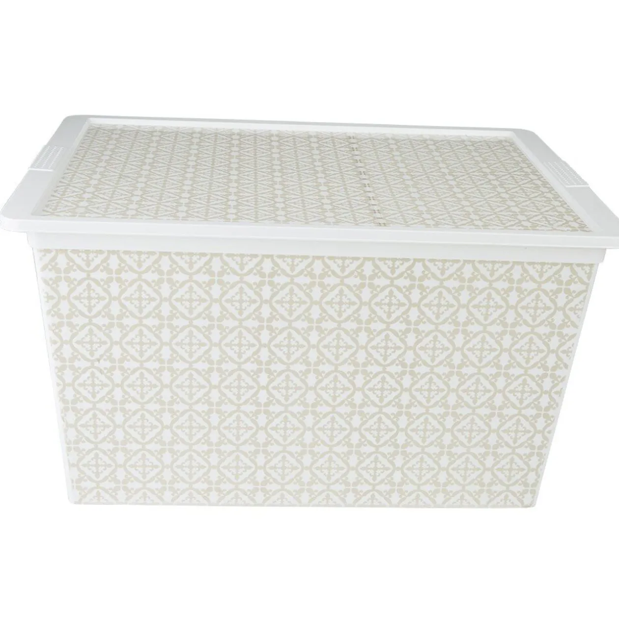 Boîte de rangement rectangulaire en plastique design carreau de ciment taupe et blanc.