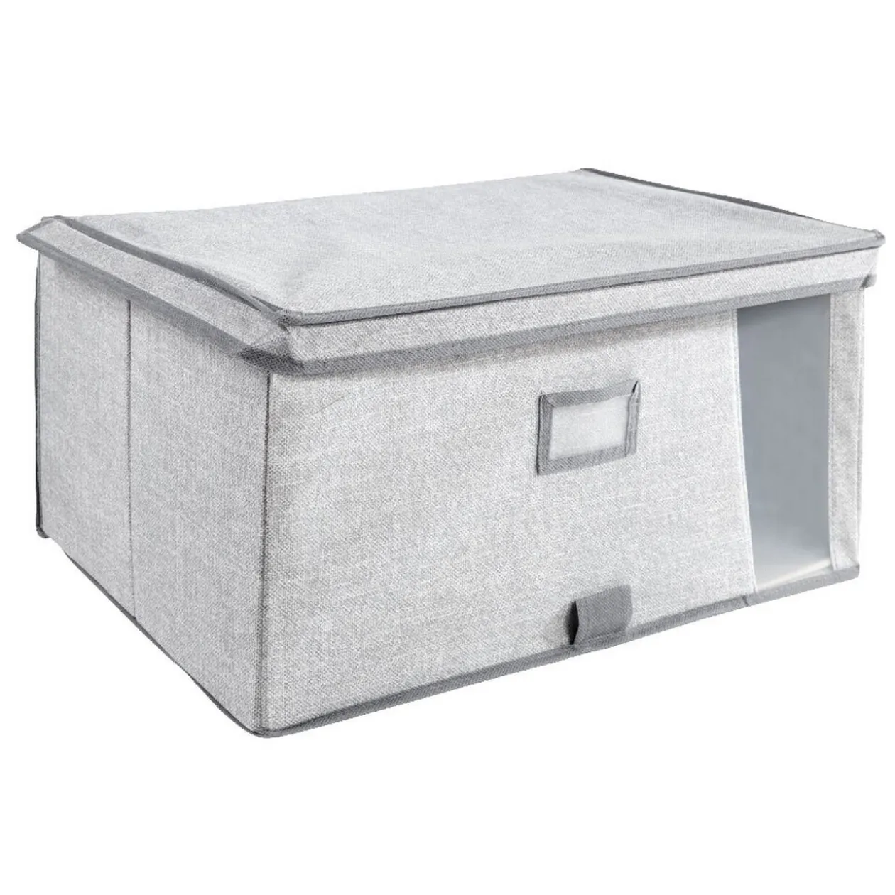 Boîte de rangement grise repliable, contenu visible avec emplacement étiquette.