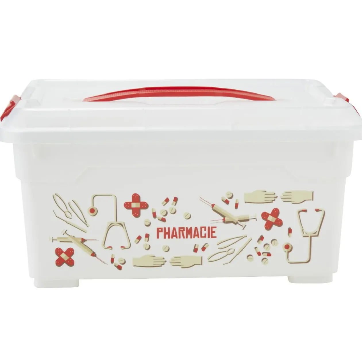 Boîte de rangement pharmacie avec plateau intérieur amovible à 4 compartiments.