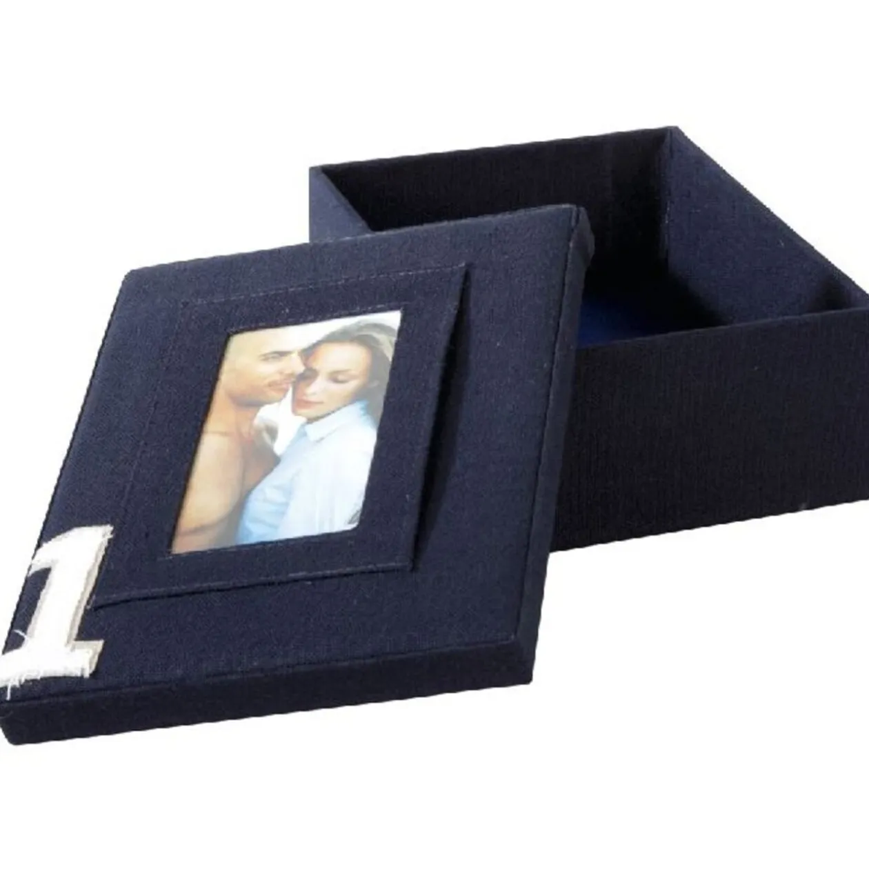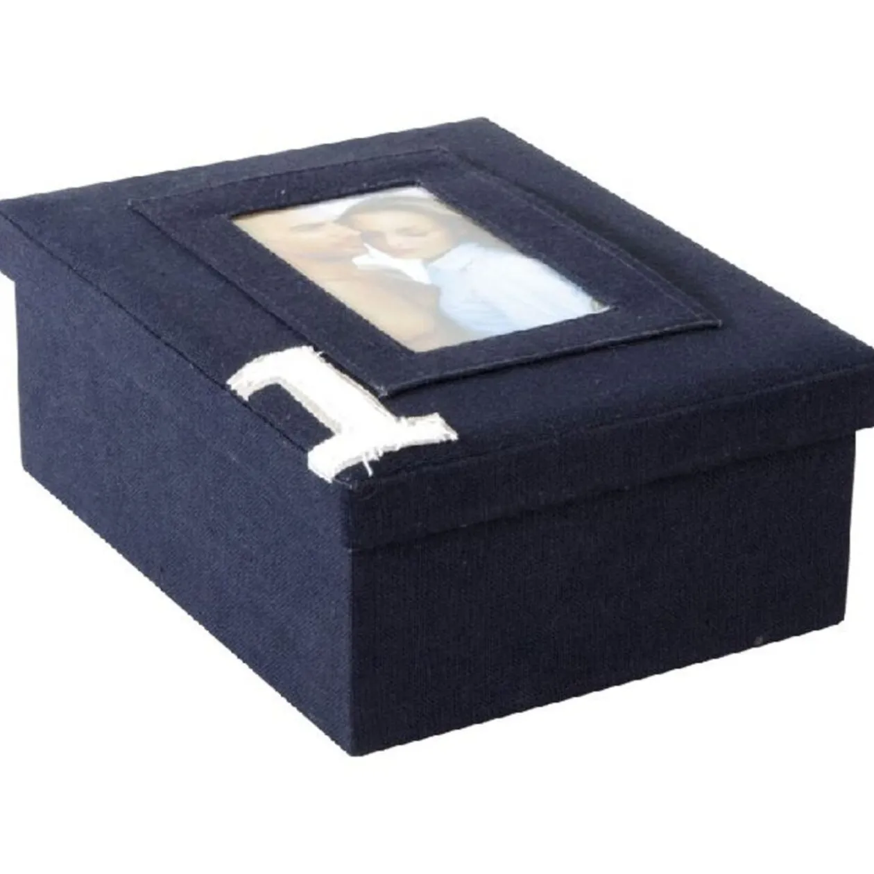 Boîte « porte photo », dim. 23×18,5×9 cm, bois et tissu, pour photo dim. 10×15 cm.