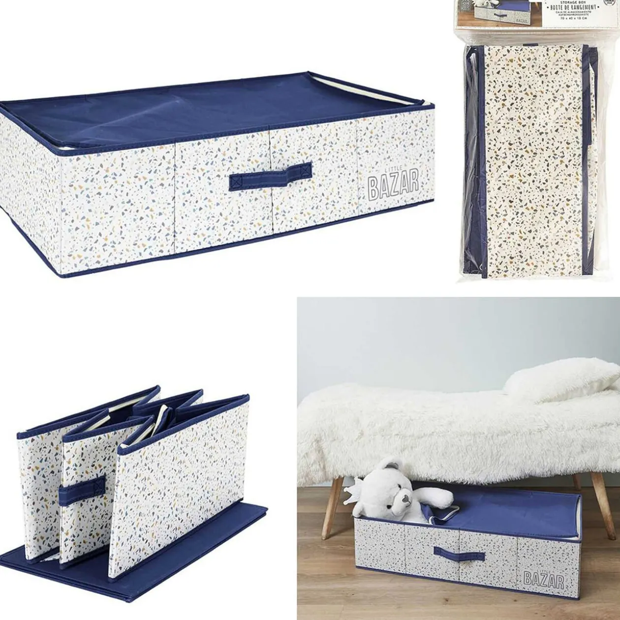 Boîte de rangement bleu marine et blanche imprimée motif terrazzo avec inscription « Little Bazar » à placer sous le lit pour optimiser un maximum l’espace.