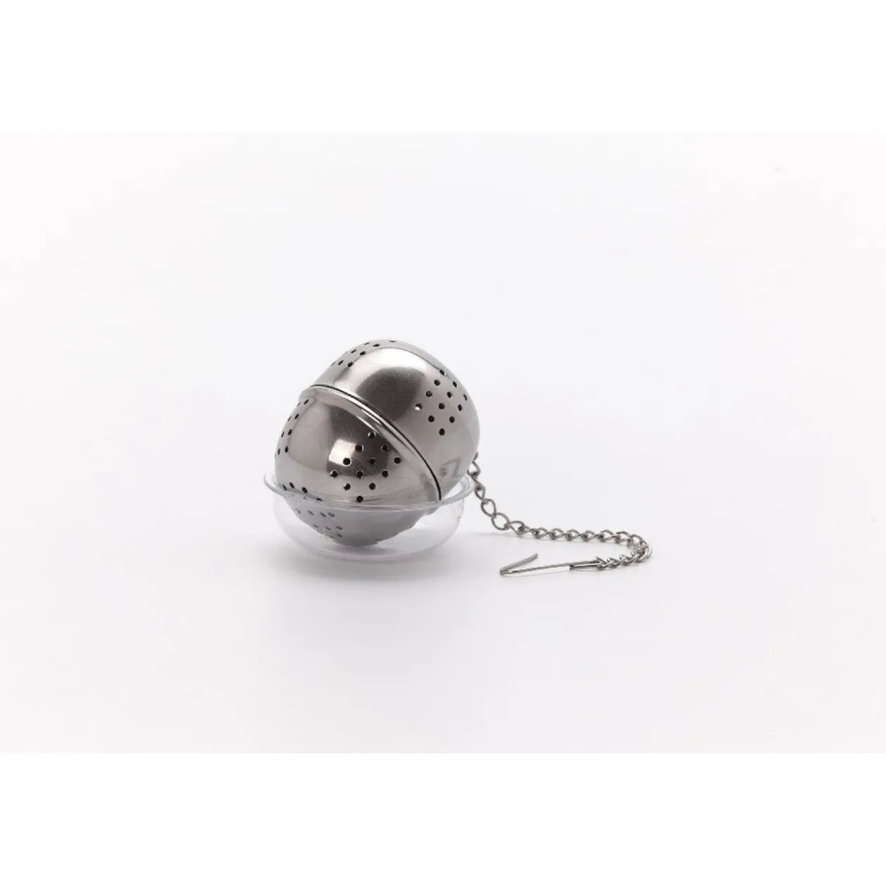 Boule à thé en inox avec son support en plastique transparent.