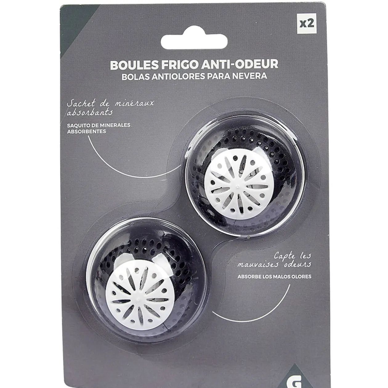 Lot de 2 boules anti-odeur contenant chacune un sachet de minéraux absorbants, idéal pour réduire les mauvaises odeurs dans le réfrigérateur.