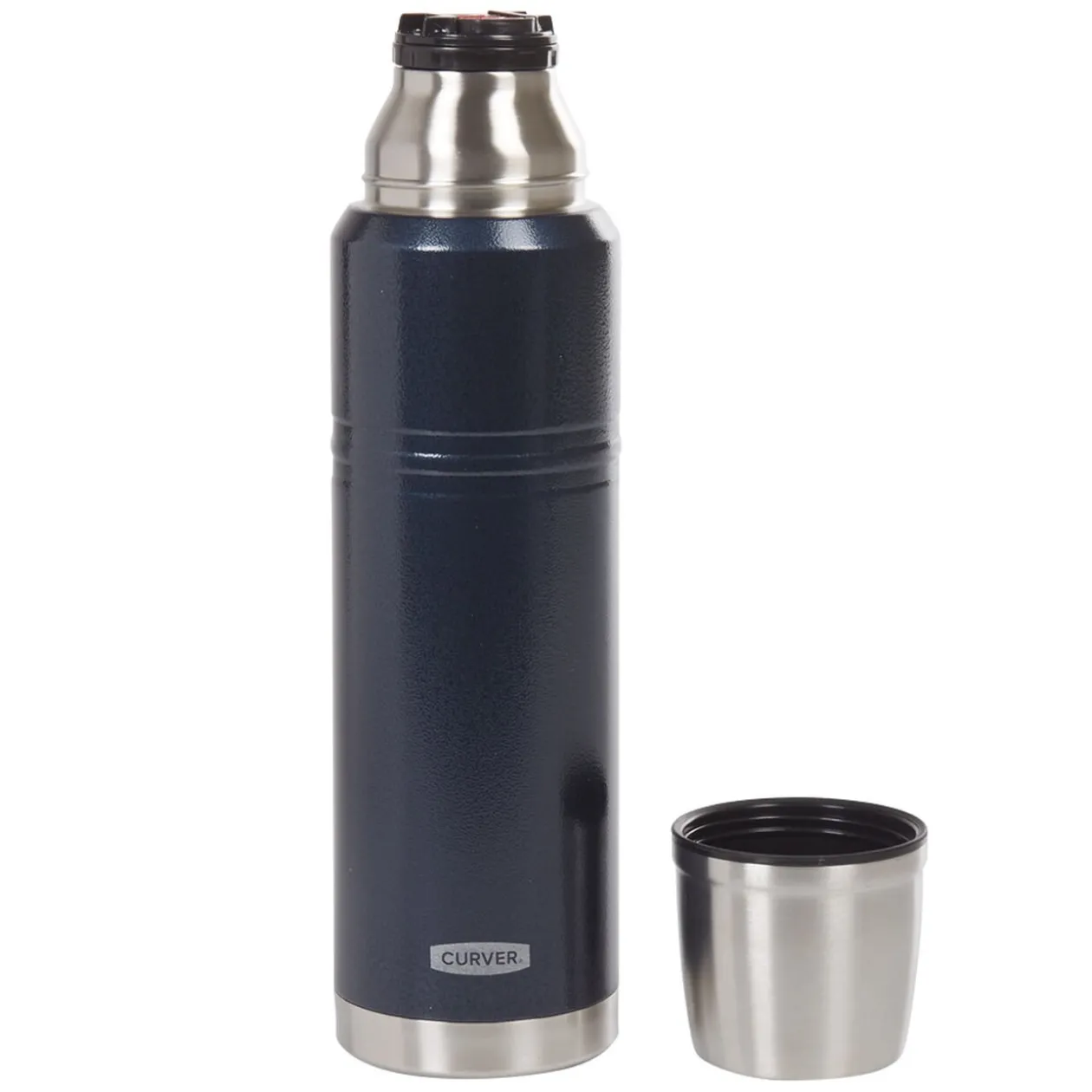 Bouteille isotherme Curver de couleur bleu nuit brillant en inox à double paroi avec isolation sous vide.