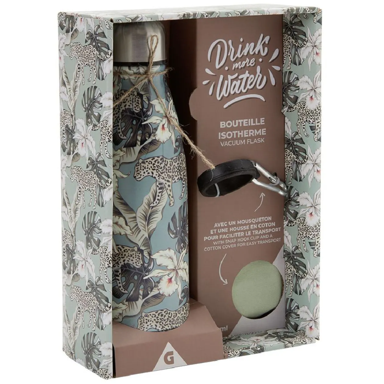 Munie d’un mousqueton et d’une housse en coton, cette bouteille sera facile à ranger et transporter.