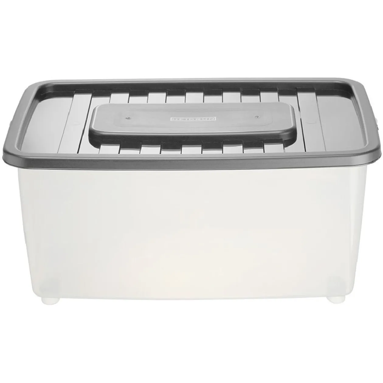 Box de rangement en plastique transparent avec couvercle de couleur.