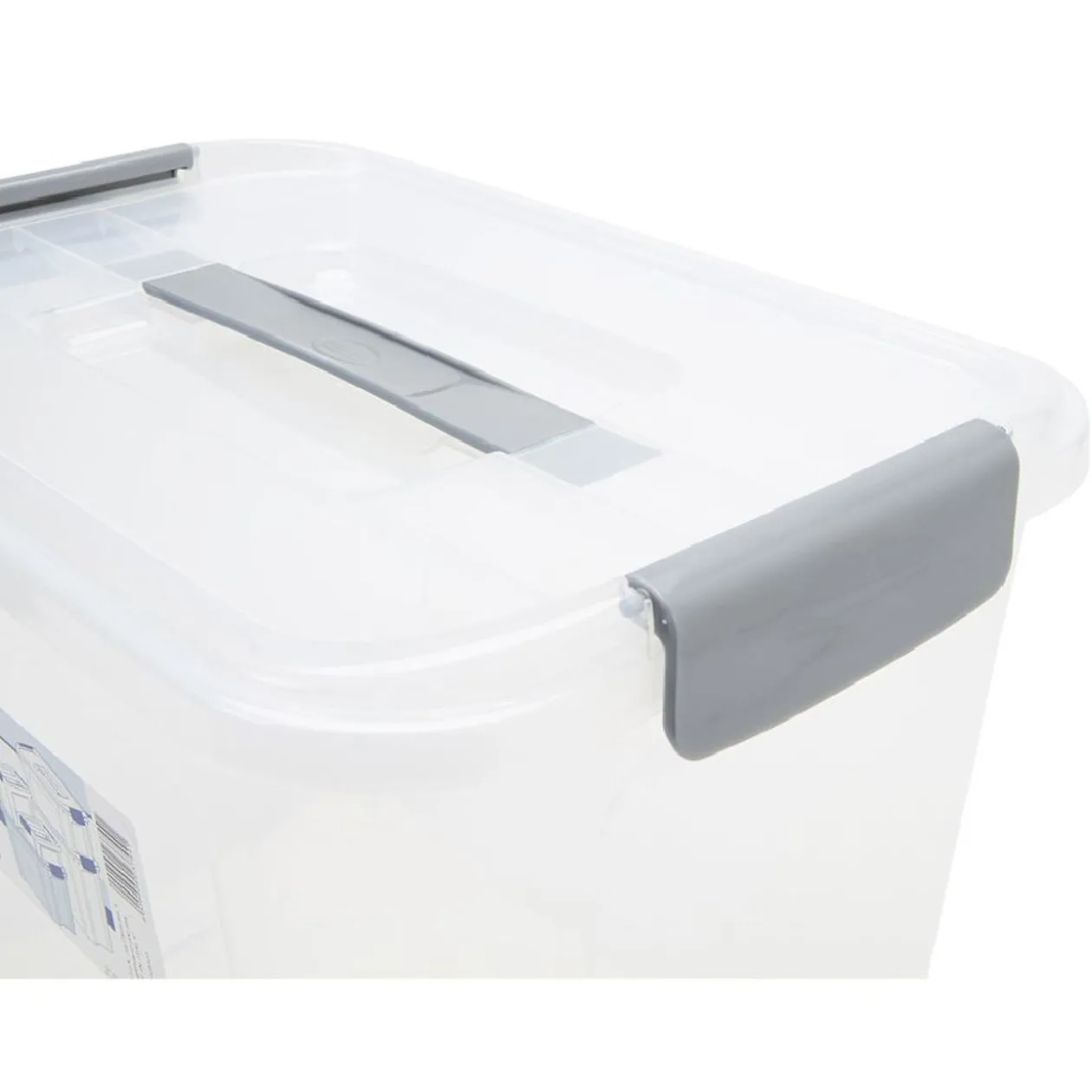 Box de rangement en plastique transparent avec clips de fermeture et poignées de préhension vers le bas pour un accès facilité.