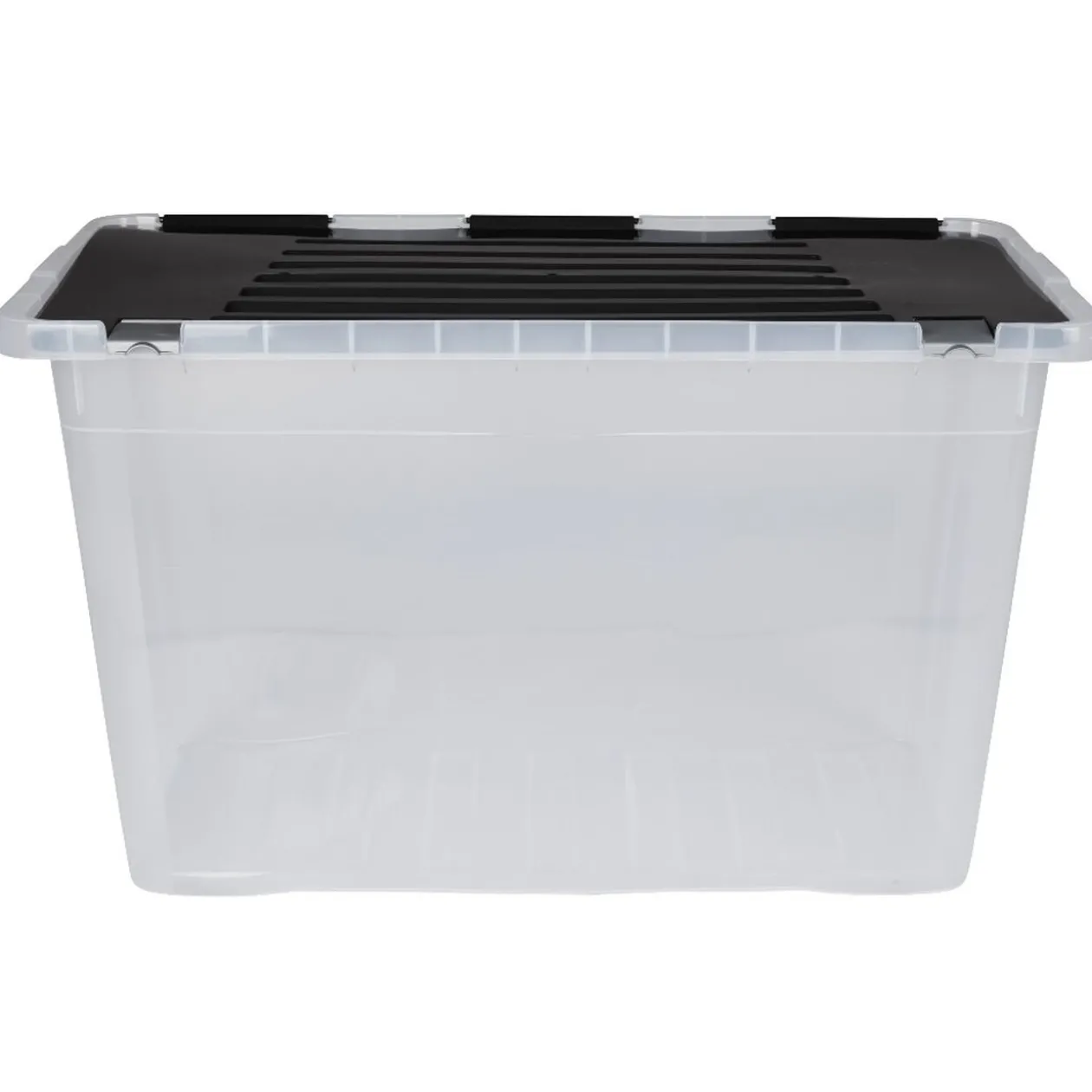 Boîte de rangement en plastique transparente avec couvercle noir. Pratique, pour vérifier en un coup d’oeil le contenu! Ce grand box d’une capacité de 100 litres avec fermeture à rabat dotée de clips vous permettra d’entreposer et stocker du linge ou matériel divers dans le bureau, le garage ou la buanderie.