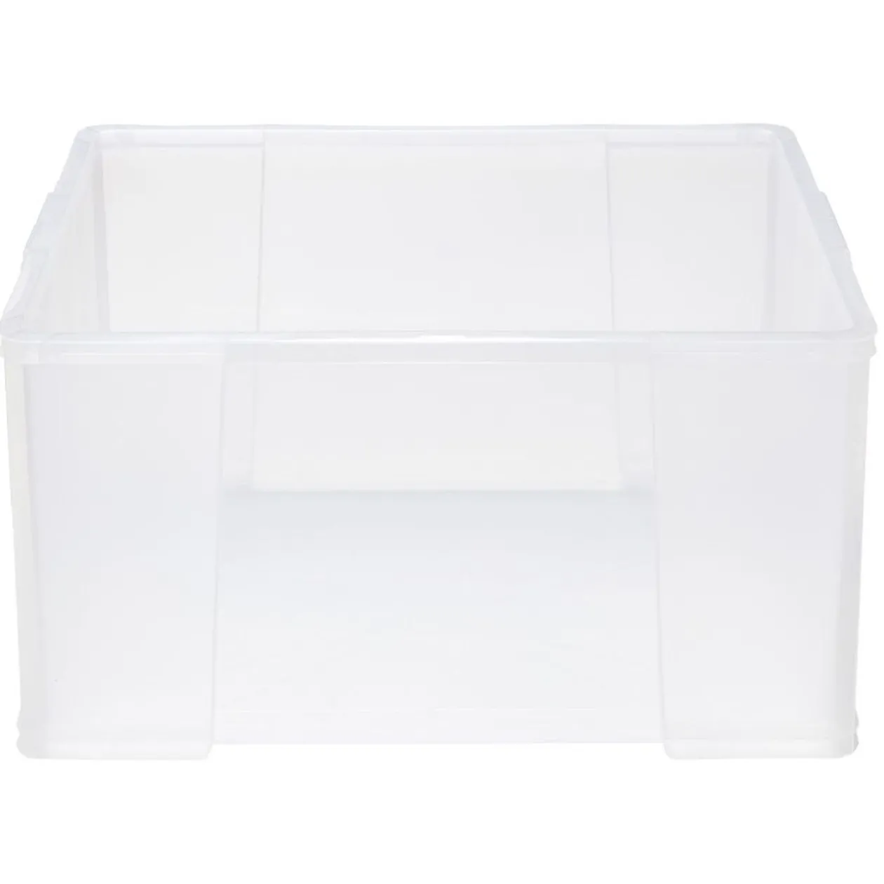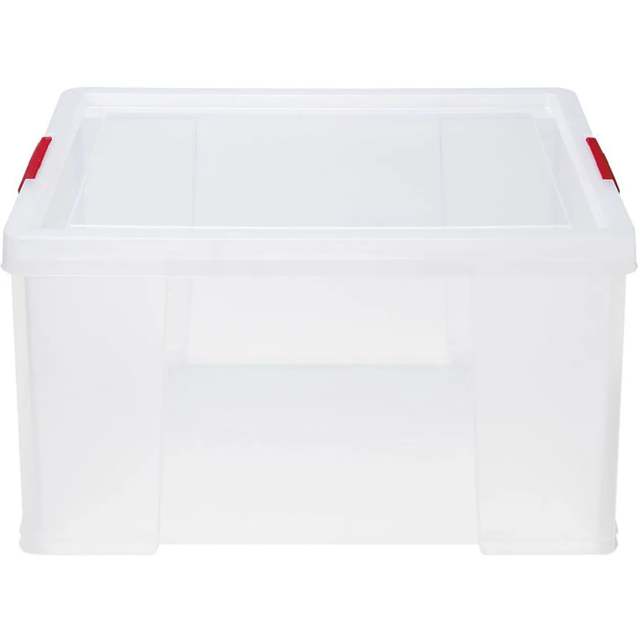 Box de rangement en plastique transparent avec couvercle à clips rouge. Idéal pour optimiser votre espace tout en organisant vos affaires.