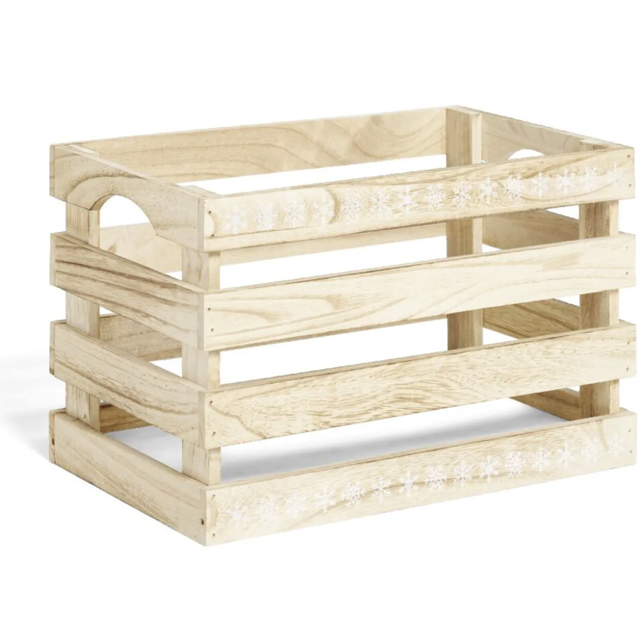 Caisse de rangement en bois à motifs flocons blancs pour la petite touche déco hivernale.
