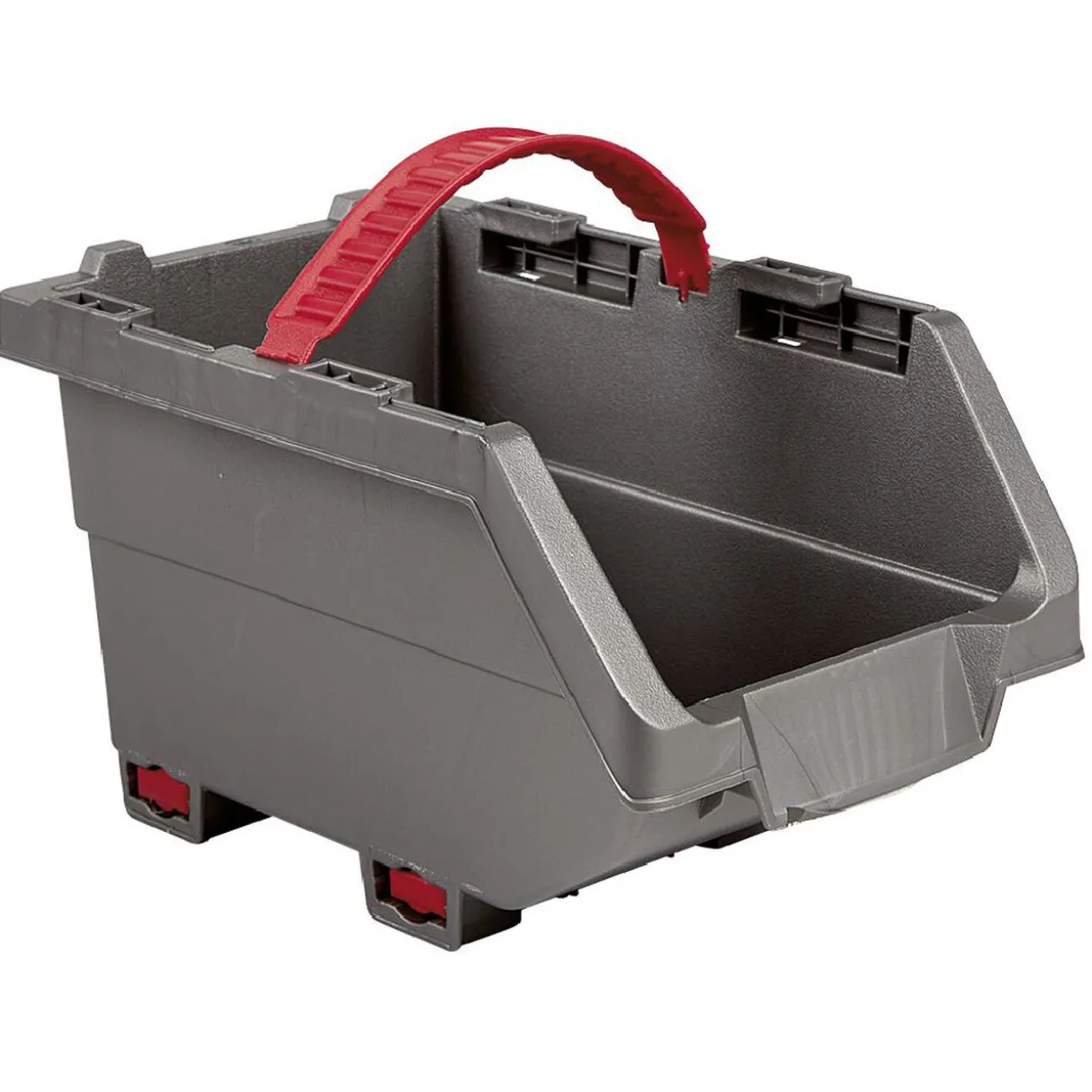 4 casiers de rangement superposables de couleur gris avec anse rouge.