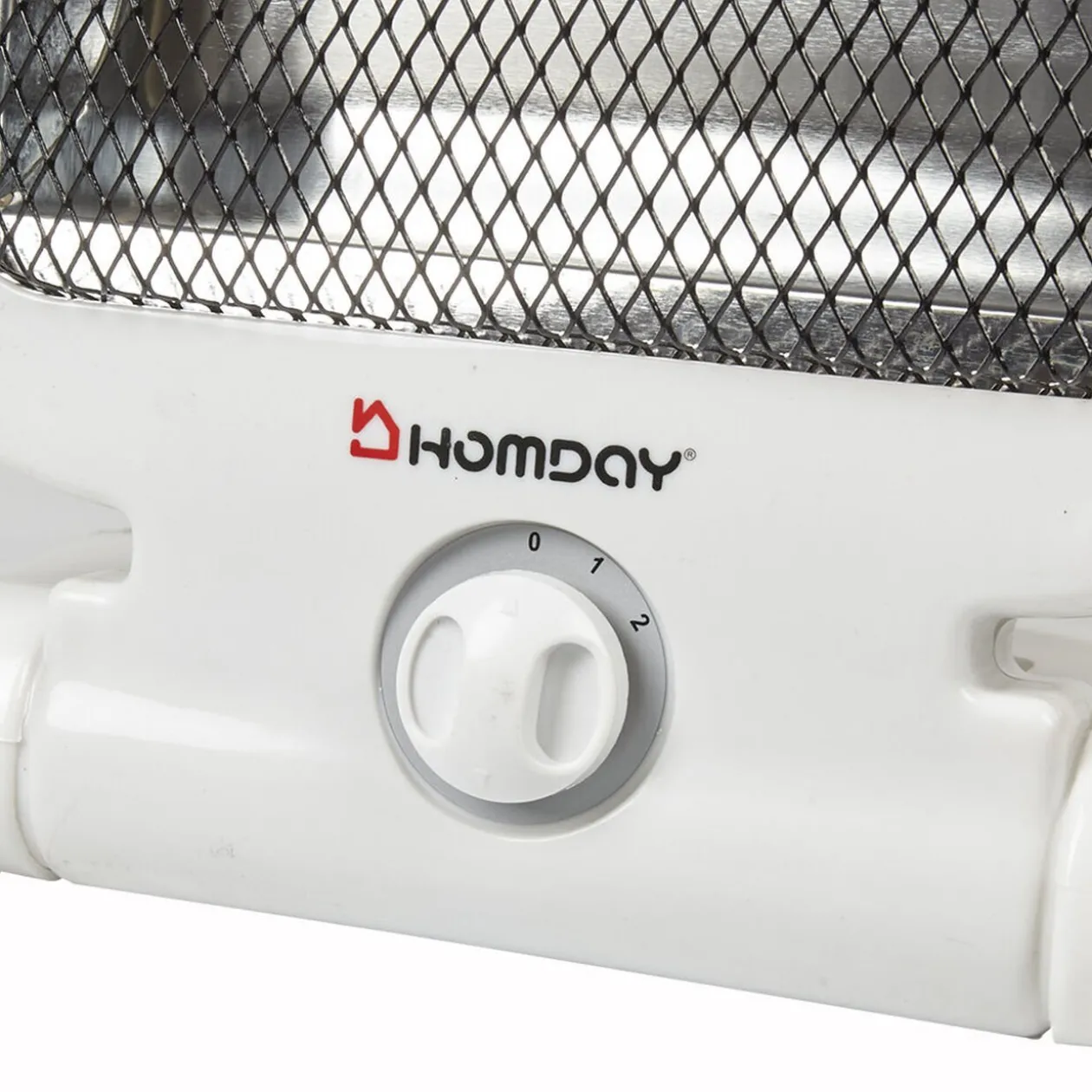 Chauffage d’appoint Homday, 2 allures de chauffe : 700 et 800 W, technologie quartz, fonctionne sur secteur. Température réglable, poignée de transport et système antibascule. Dim. 24x19xh.38,5 cm, plastique. Garantie 2 ans..