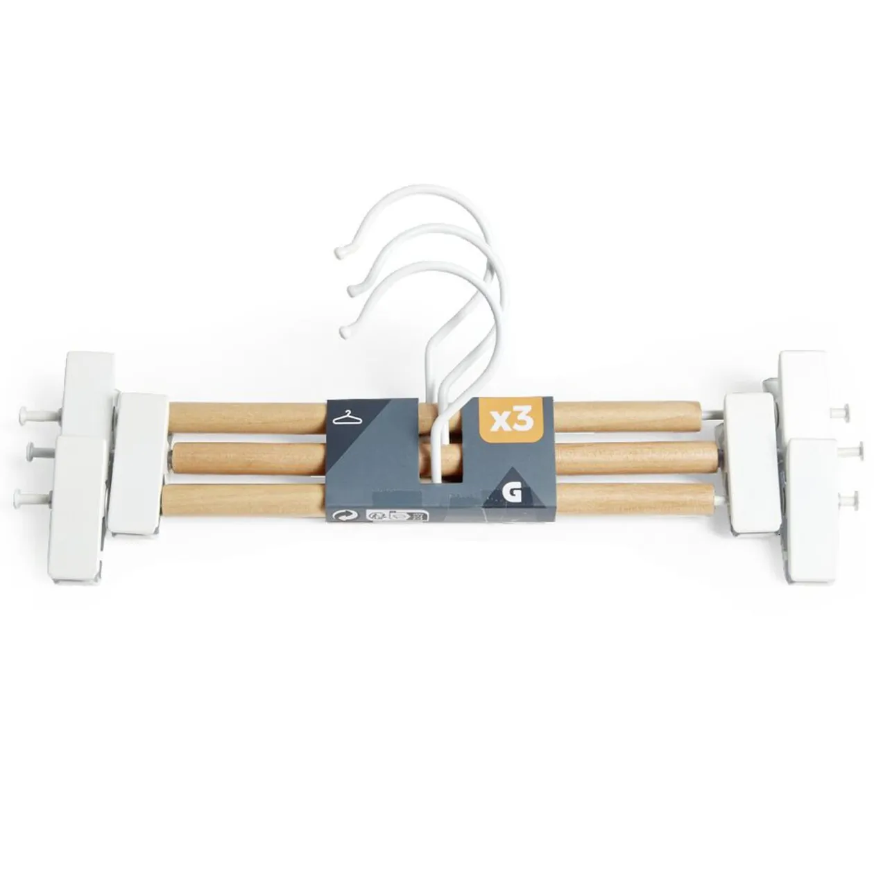 Accrochez vos vêtements avec élégance avec ce lot de 3 cintres à pinces en métal blanc et en bois naturel.
