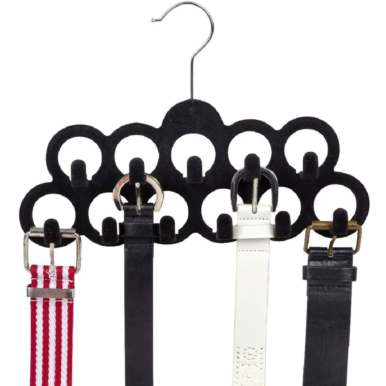 Gagnez de la place dans vos tiroirs grâce à ce cintre porte-ceinture en plastique renforcé et velours noir.