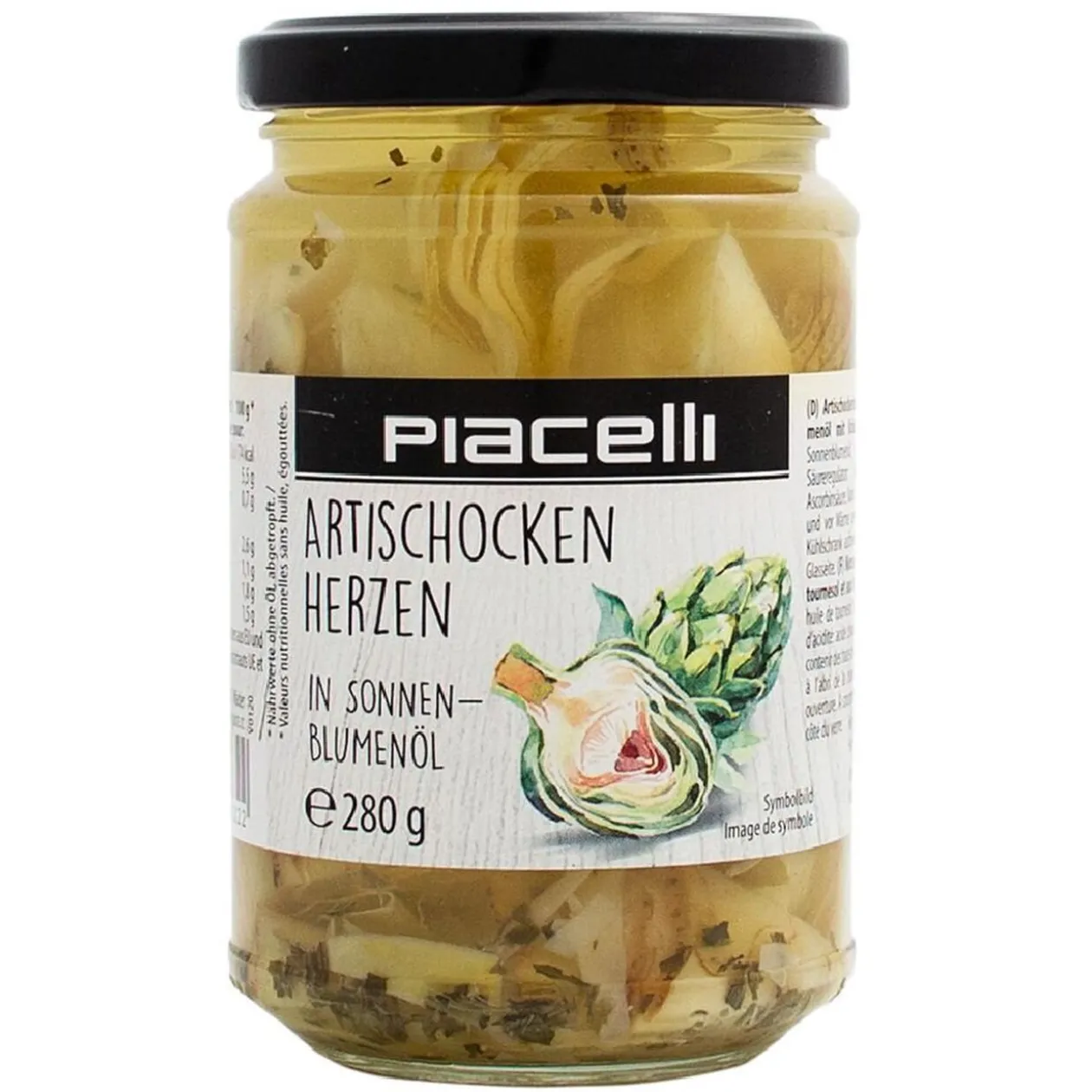 Composition : artichauts 57%, huile de tournesol, sel, vinaigre d’alcool, persil, correcteur d’acidité: acide citrique antioxidant: acide ascorbique.
