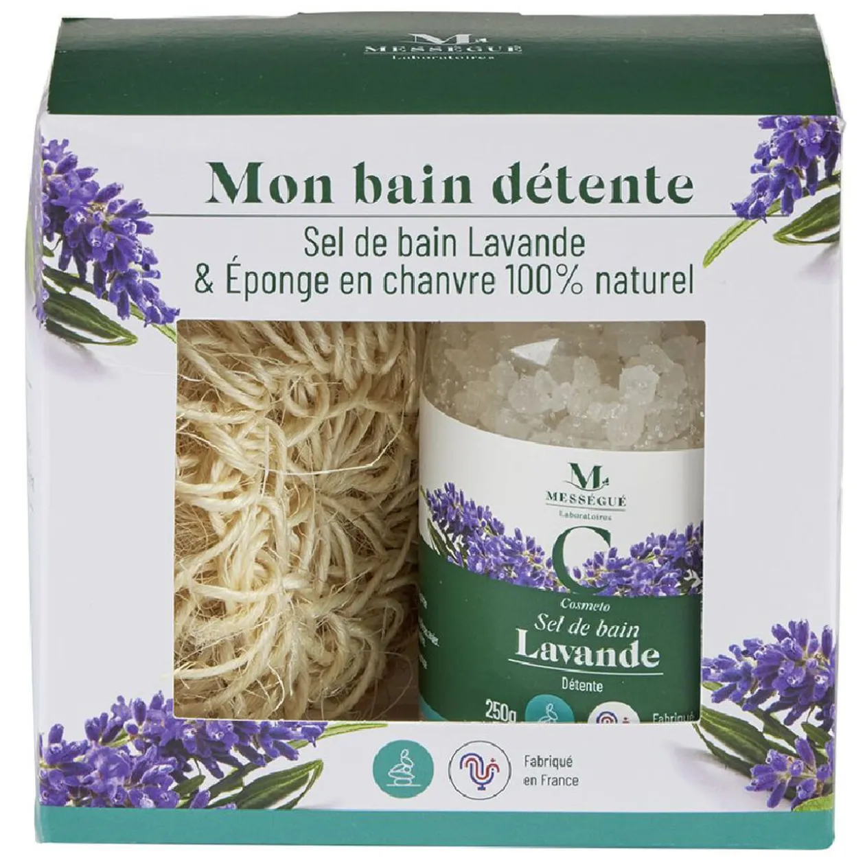 Coffret Mességué comprenant 250g de sel de bain fabrication française à base de lavande récoltée en France et une éponge en chanvre 100% naturel qui offre une meilleure durabilité, qui sèche vite évitant ainsi la prolifération des bactéries et qui est compostable une fois en fin de vie. Profitez d’un instant bien-être pour un moment détente assuré !