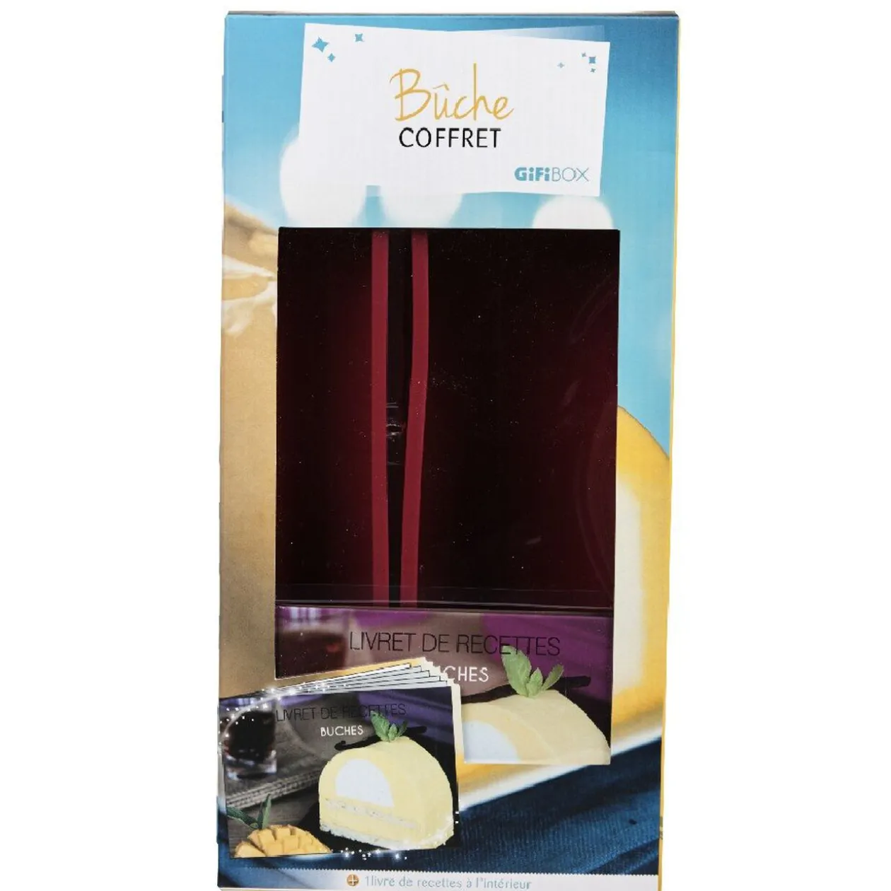 Coffret moules silicone buche de noël, comprend 1 moule à buche de dimension 30×9 cm, 1 moule à insert de dimension 29×4.5 cm et 1 livre d’une trentaine de recettes