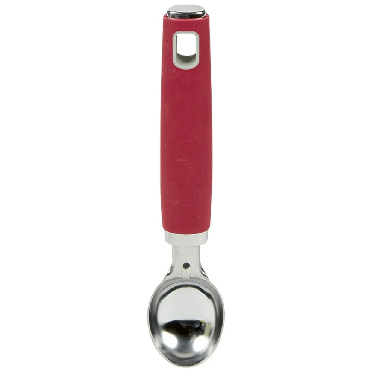 Cuillère à glace en inox avec manche ergonomique en polypropylène rouge.