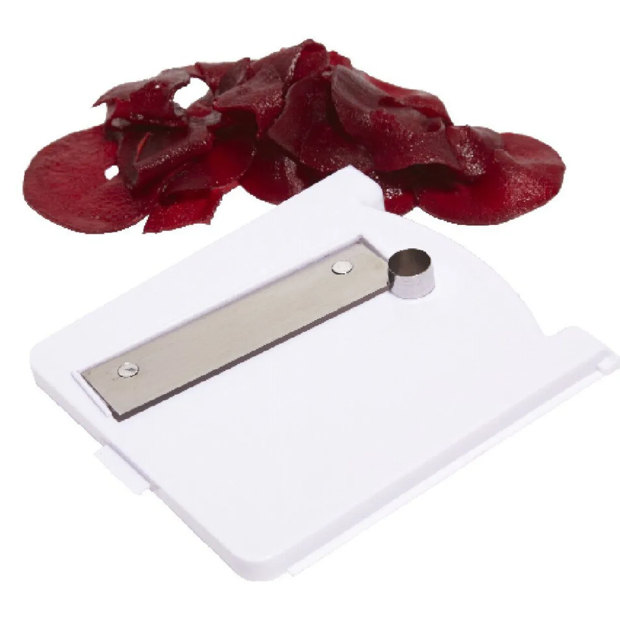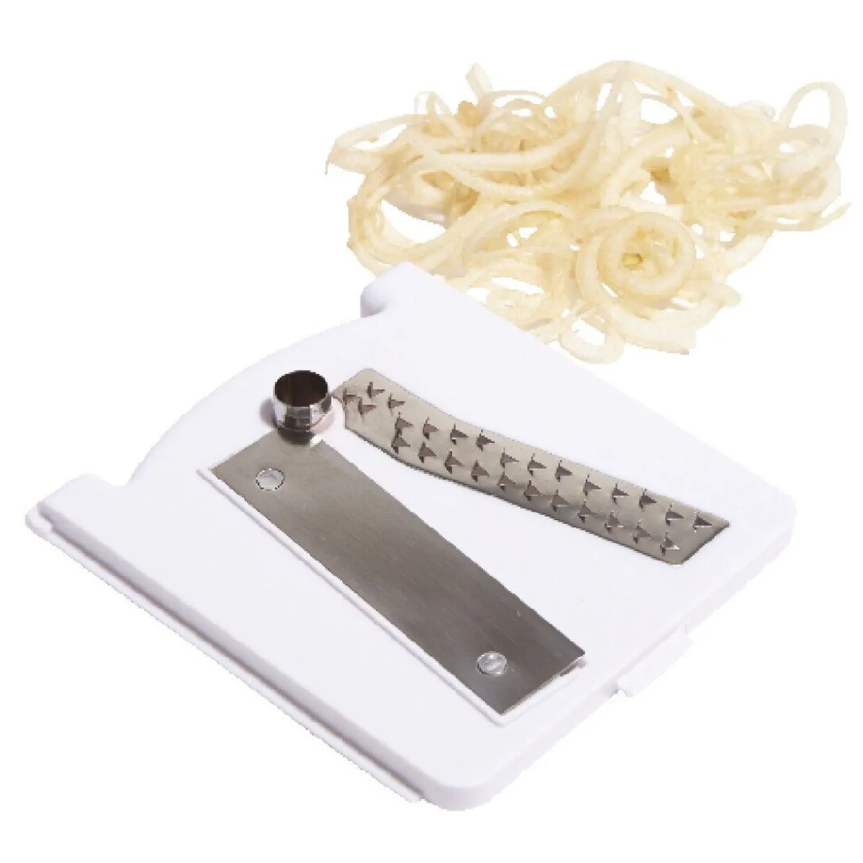 Découpeur 3 en 1 comprenant 3 lames interchangeables pour râper, couper en tranches ou en rondelles la plupart des légumes et des fruits.