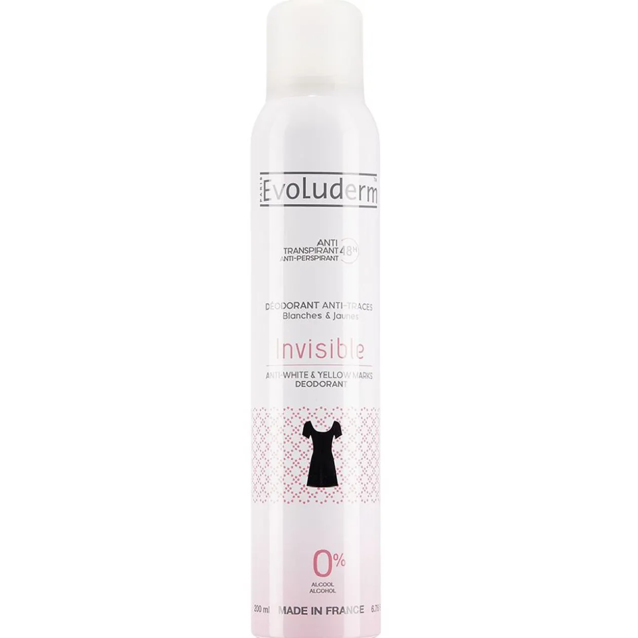 Déodorant Evoluderm invisible, une formule anti-traces sans sels d’aluminium et efficace durant 48 heures.