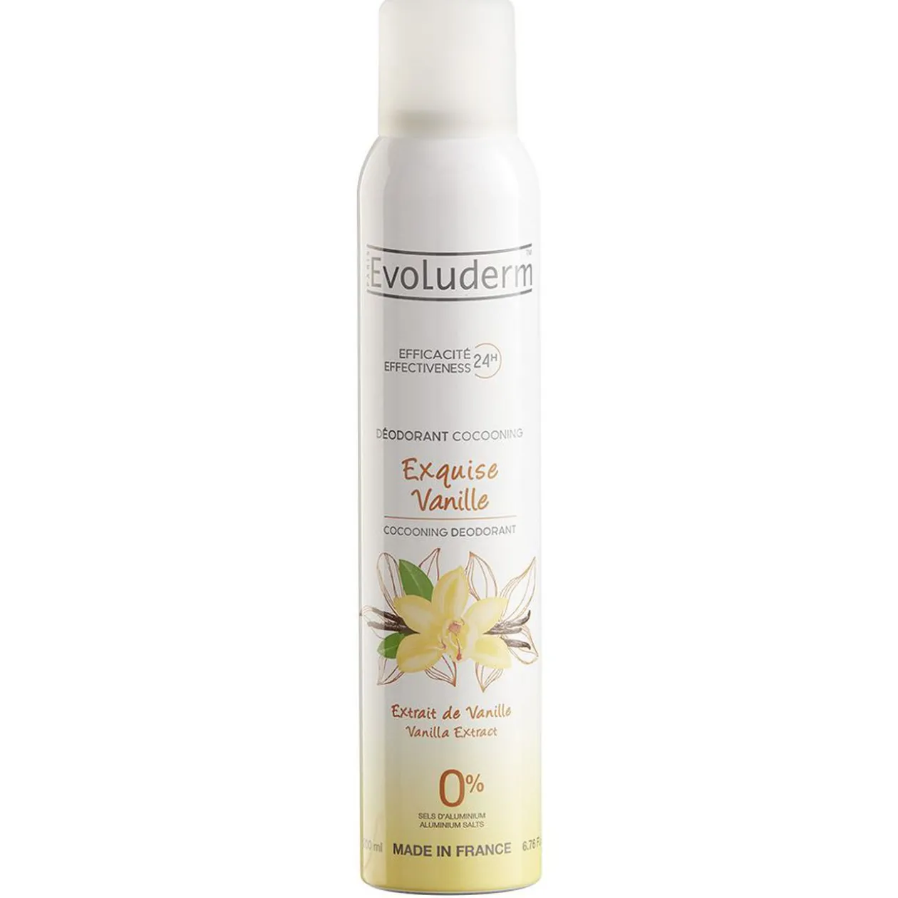 Déodorant Evoluderm aux extraits de vanille, le parfum cocooning sans sels d’aluminium et efficace durant 24 heures.