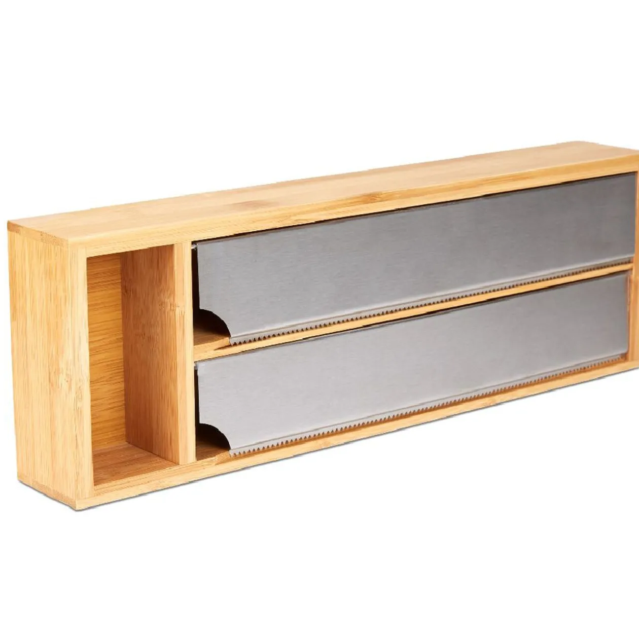 Ce dérouleur en bambou dispose de 3 emplacements dont 2 vous permettant de mettre vos rouleaux de papier sulfurisé, aluminium ou cellophane et 1 autre emplacement pour un flacon d’épice.