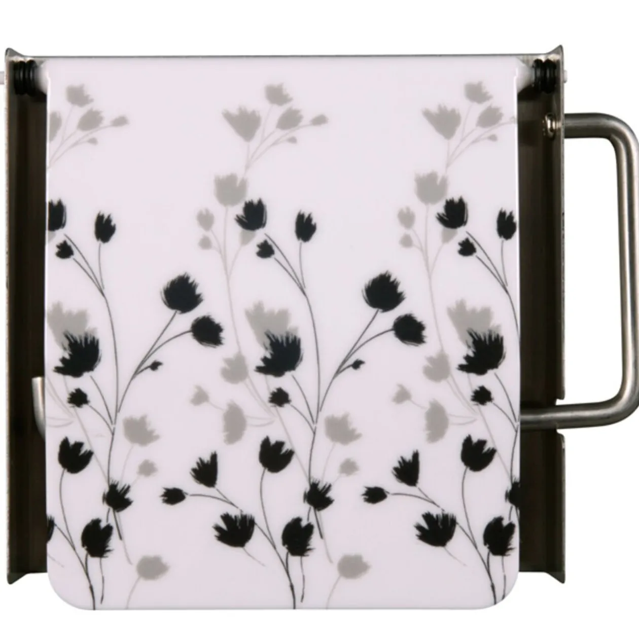 Dérouleur papier toilette fleur, noir et blanc, inox et plastique mélaminé.