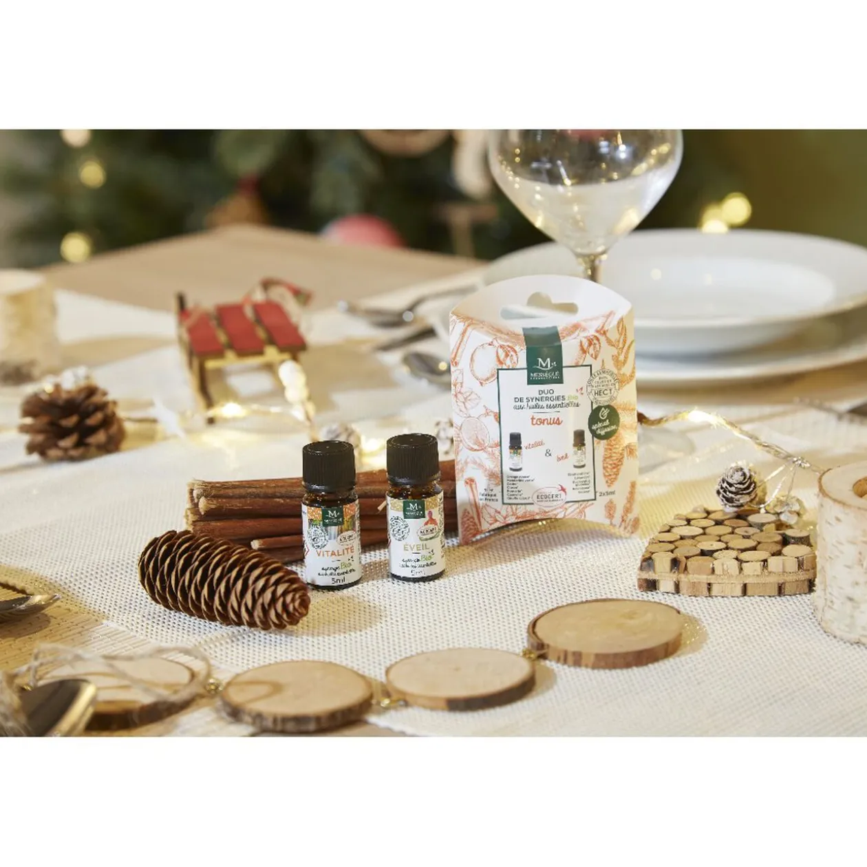 Duo d’huiles essentielles Tonus à diffuser : Vitalité à base d’huile essentielle d’orange douce et Eveil à base de lavande et de thérébenthine.