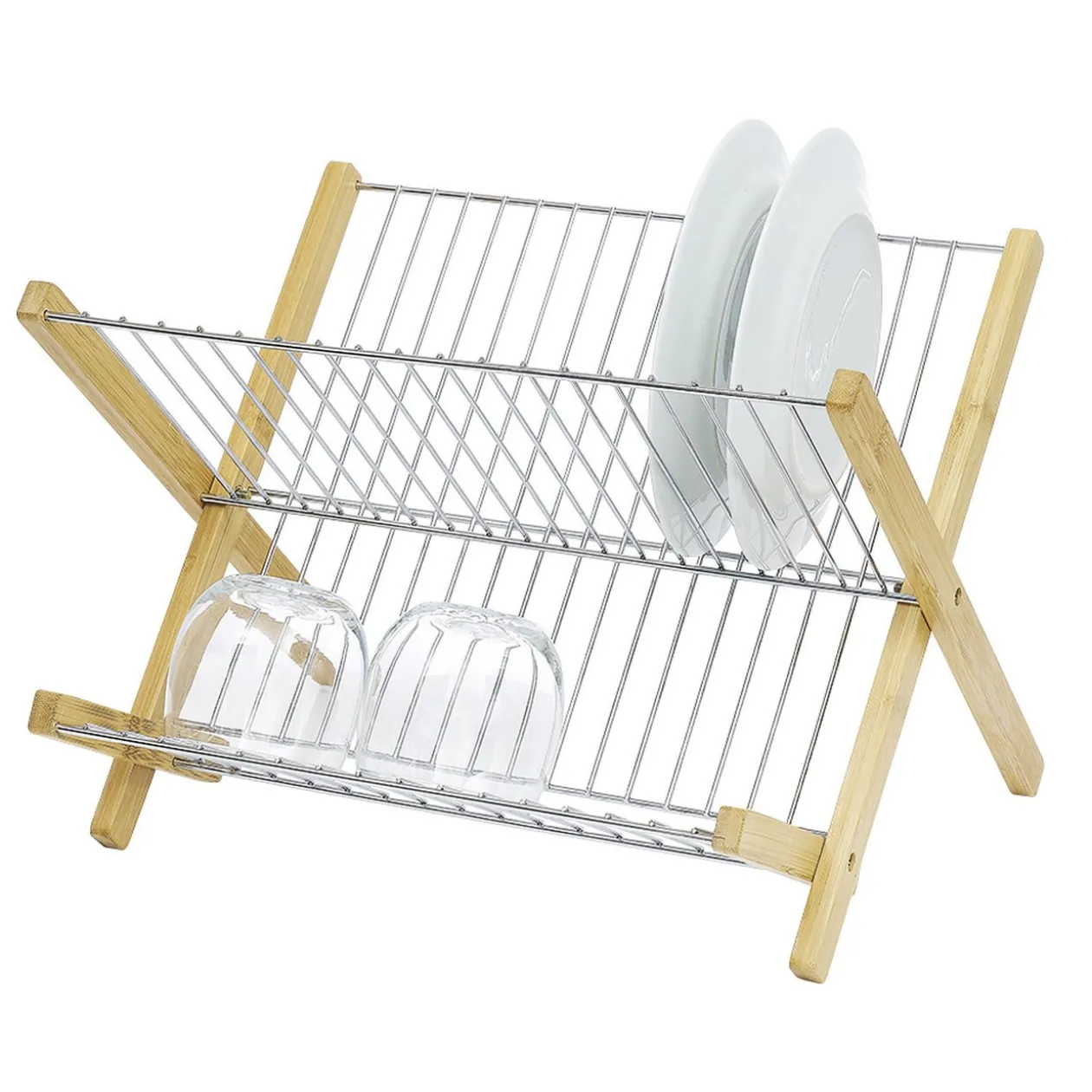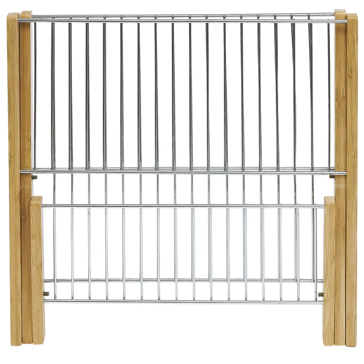 Égouttoir à vaisselle en bambou et métal pliable à plat, idéal pour un gain de place quand il n’est pas utilisé.
