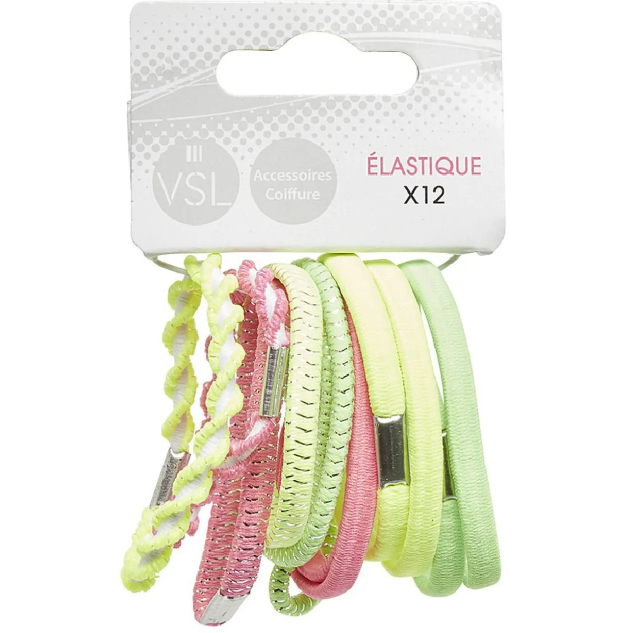 Ces 12 elastiques sont un melange de modèles de 3 couleurs vert, rose et jaune.