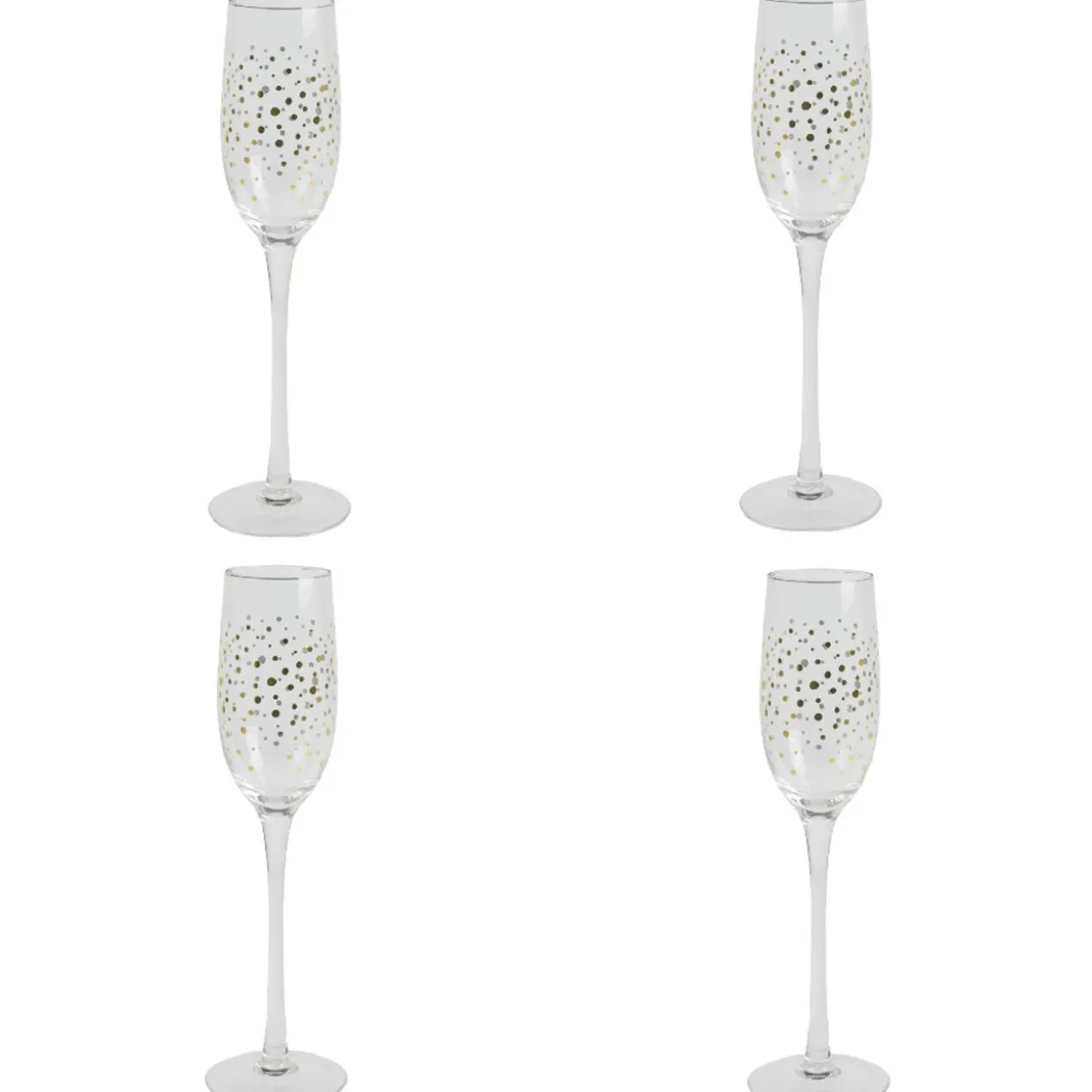 Fêtez la nouvelle année ou un heureux évènement grâce à ses 4 flûtes à bulles dorées ! Idéales pour toutes les occasions comme les anniversaires, les mariages… Ayez le chic pour un toast et faites pétiller le champagne ou un bon kir royale à la mûre. Son design pétillant à pois dorés rendra la décoration de table plus joyeuse et festive. Pensez à nos gobelets en verre assortis.